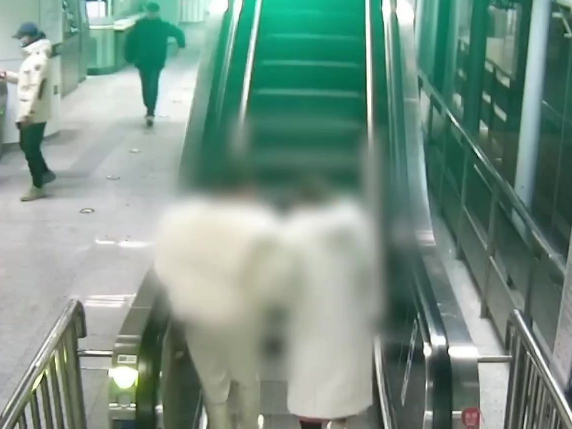 惊险!两女子扶梯失衡仰倒,民警飞身急停