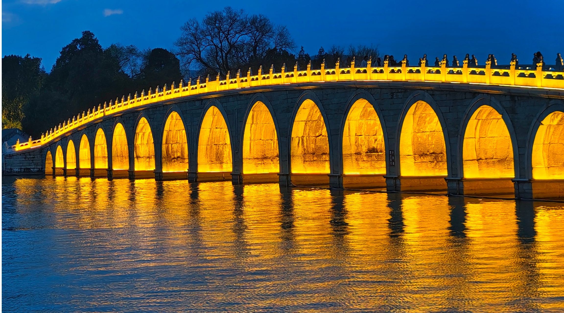 颐和园十七孔桥亮灯,夜景版“金光穿洞”再现