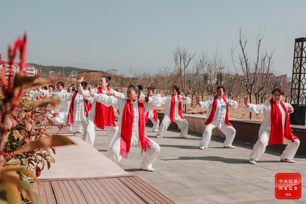 湖北省丹江口市充分挖掘山水文化资源,加强精神文明建设,鼓励当地群众开展丰富的文化活动。图为该市武术协会成员在习家店镇农博园内操练太极拳。(湖北省丹江口市纪委监委供 夏君 摄)