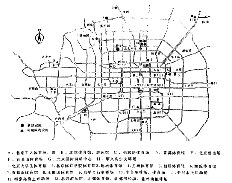 北京作为新中国的首都,在解放后有较大的发展,50年代在崇文门外建起了北京体育场和体育馆,以后又继续按城市总体规划布局建设了东郊工人体育场和体育馆、西郊的首都体育馆,即形成了以“三场三馆”大型体育设施为主的公共体育设施布局。考虑到当时我国经济实力有限,离1990年召开亚运会筹备工作的时间紧迫,因此,必须充分利用和改造某些已有的设施,总共约需30多个比赛场馆,其中有13项为利用、改造、扩建原有设施来安排。