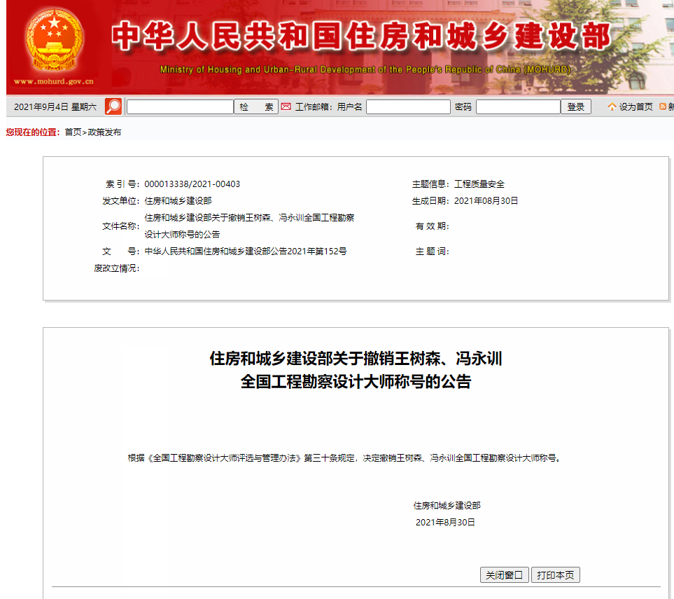 住房和城乡建设部官网日前发布公告:根据《全国工程勘察设计大师评选与管理办法》第三十条规定,决定撤销王树森、冯永训全国工程勘察设计大师称号。