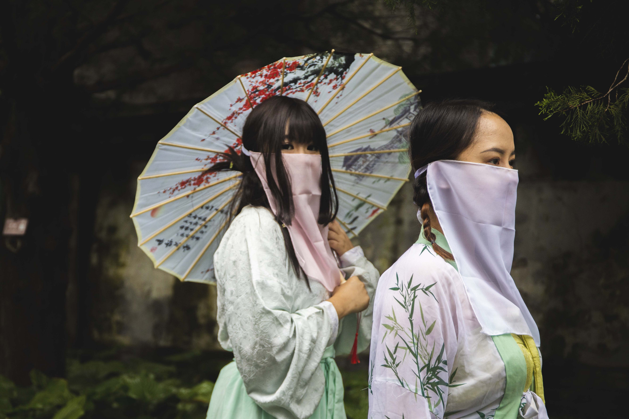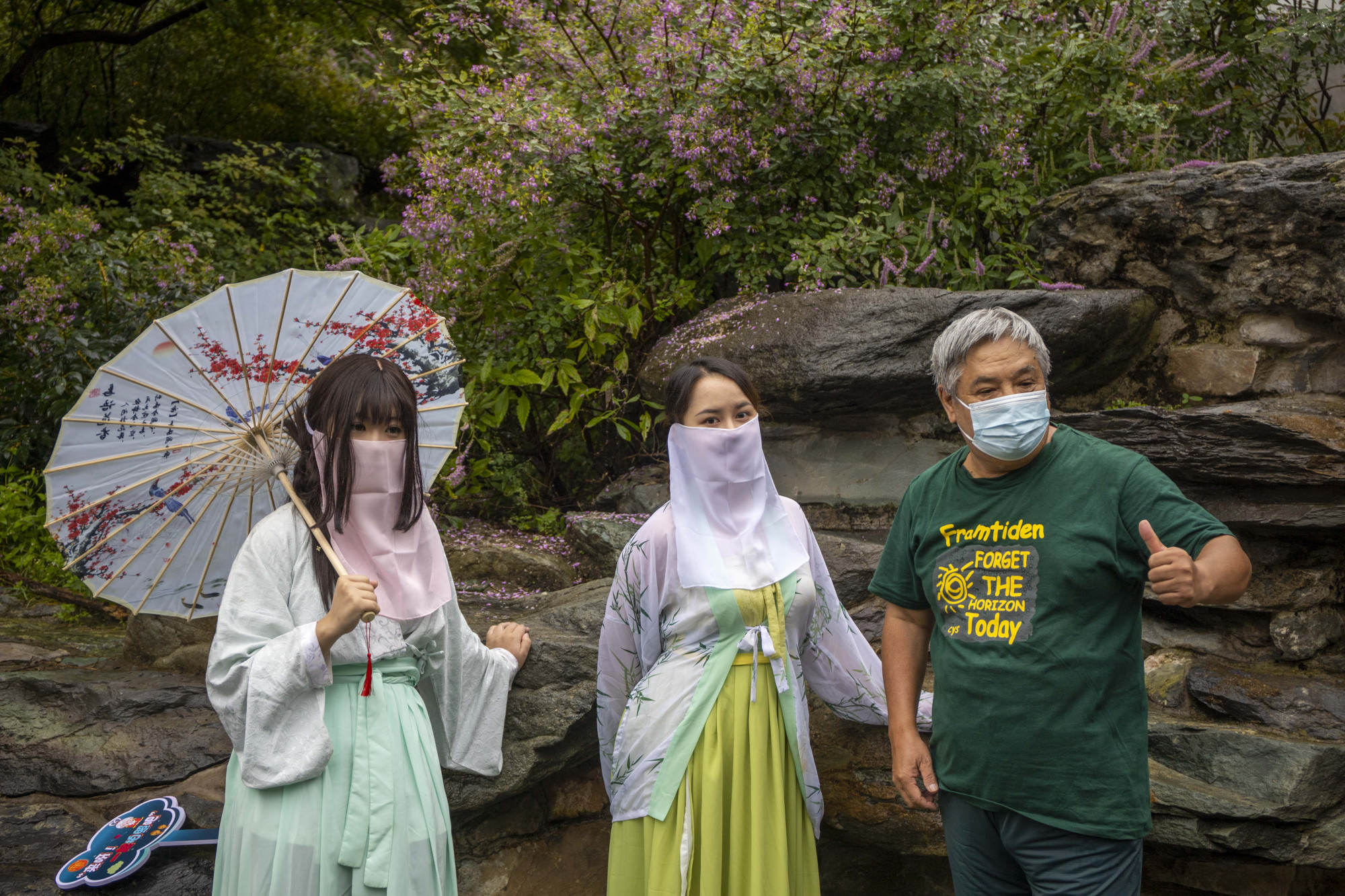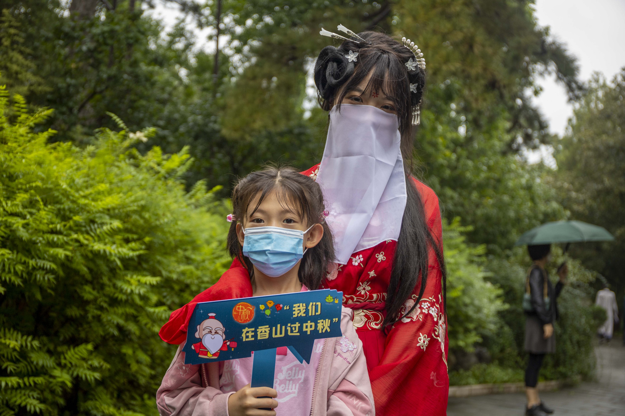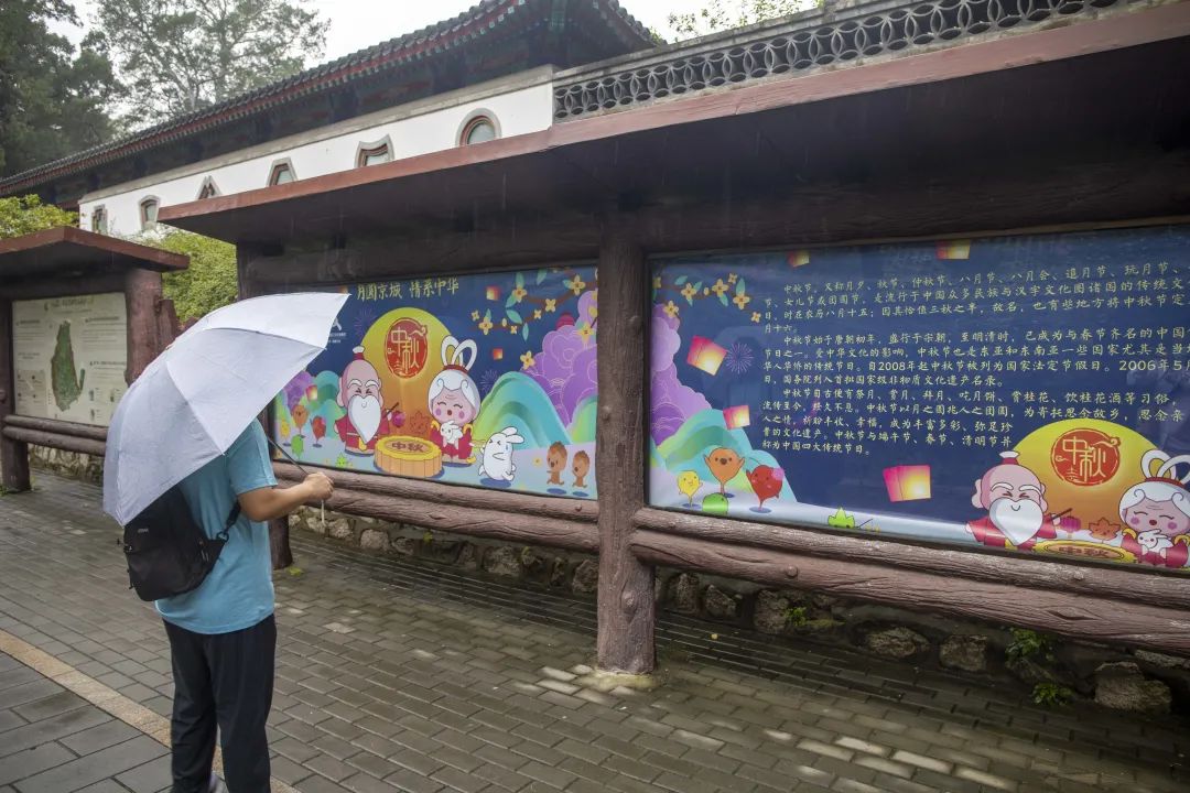 淅淅沥沥的小雨,烟雨濛濛的景致,让公园的景色好似一幅传统山水画。身着各式汉服、手撑油纸伞的青年男女,伴随着氤氲的水雾和浓郁的桂花香气在园内游园赏景,引得游客纷纷驻足欣赏这道“行走的国风文化墙”,合影留念。