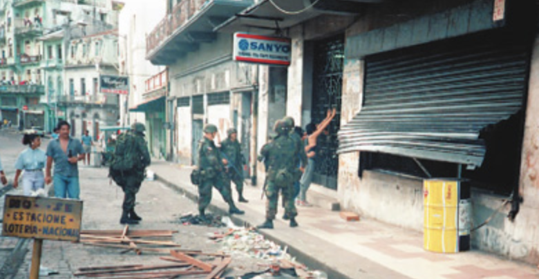 1989年,美国因巴拿马运河管辖等问题武装干涉巴拿马。图为占领巴拿马的美军士兵在巴拿马城街头搜查行人。新华社记者 胡泰然摄