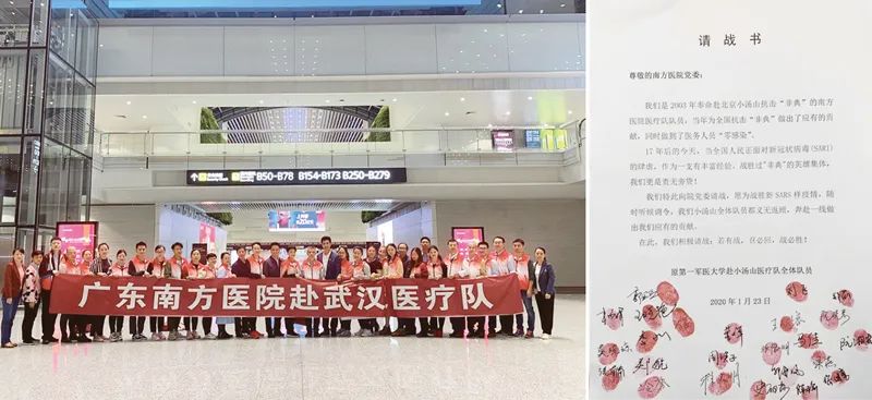 面对新型冠状病毒肺炎疫情的突然来袭,白衣战士们主动请缨,奋战于抗击疫情一线,用行动践行了共产党员“随时准备为党和人民牺牲一切”的初心和誓言。左图为2020年1月24日,除夕之夜,南方医院赴武汉医疗队成员响应国家号召,紧急支援湖北省疫情救治工作。其中,有两人曾参与2003年原第一军医大学南方医院赴小汤山医疗队(新华社发)。右图为原第一军医大学南方医院赴小汤山医疗队全体队员的请战书。