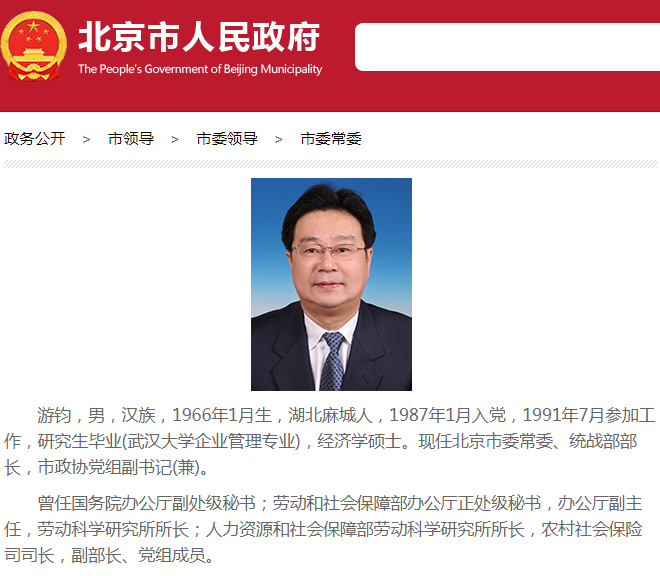 10月28日,北京市人民政府网站“政务公开”栏目显示,游钧已出任北京市委常委、统战部部长,市政协党组副书记(兼)。