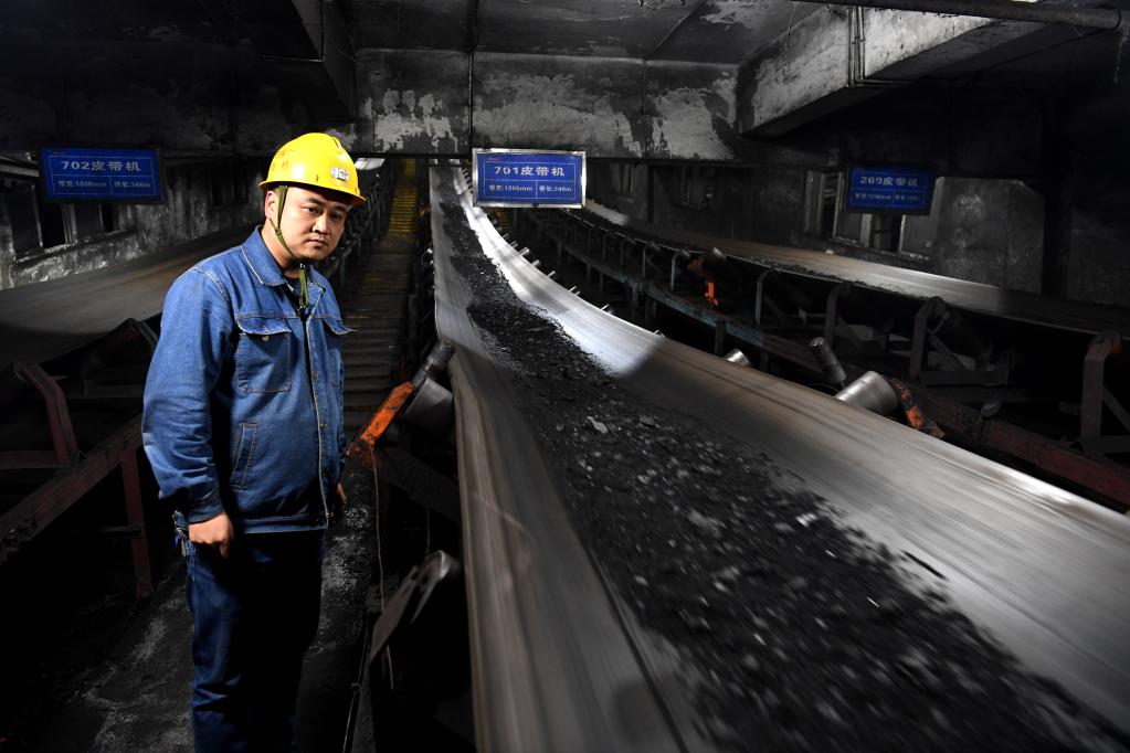 10月20日,在安徽省宿州市钱营孜煤矿,电煤通过传送带入仓等待外运。新华社记者 刘军喜 摄
