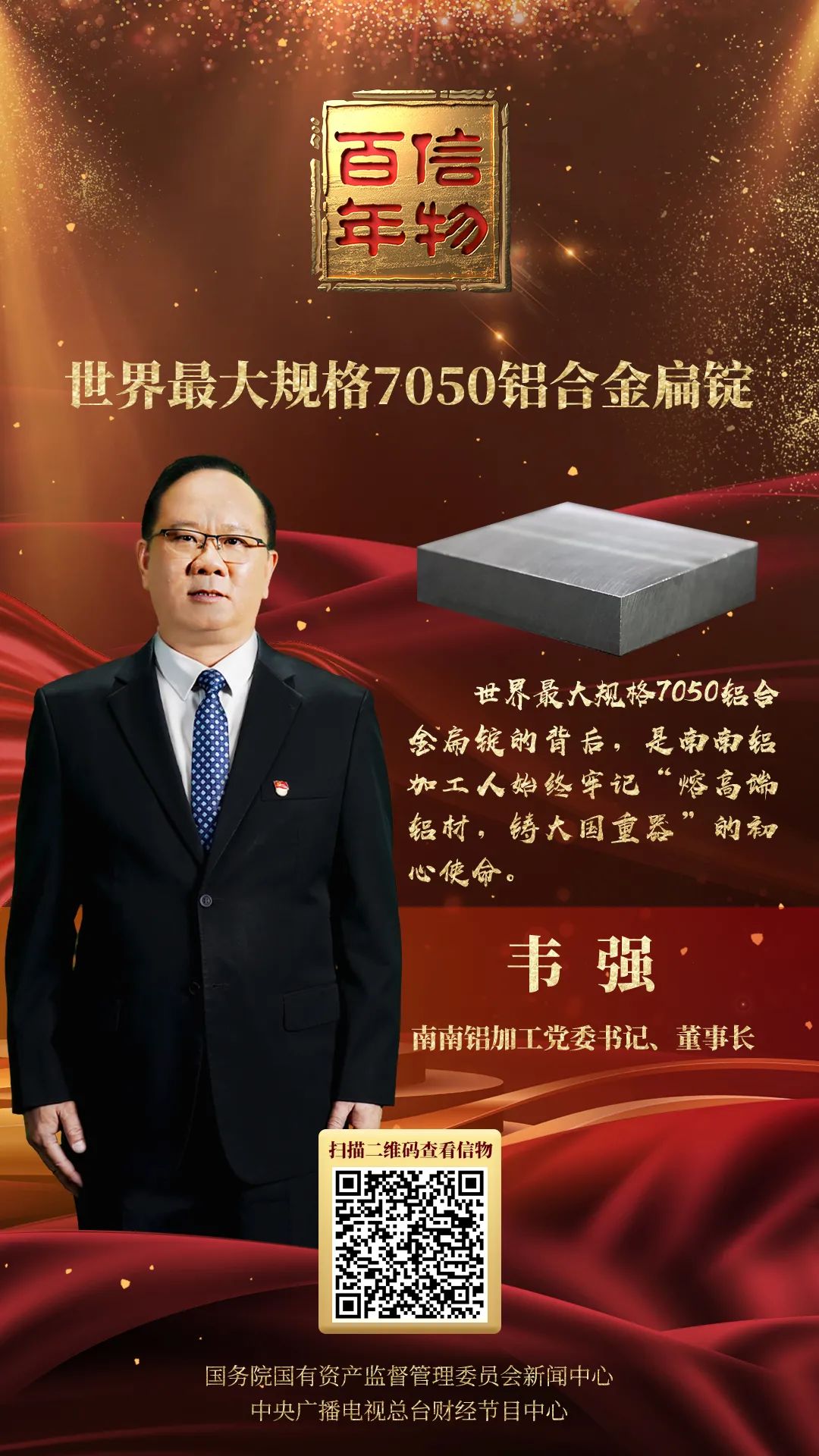 今天,与您分享《信物百年》第93集《世界最大规格7050铝合金扁锭》,听信物讲述人,广西南南铝加工有限公司党委书记、董事长韦强讲述铸造世界最大规格7050铝合金扁锭,落实国家重大战略的故事。
