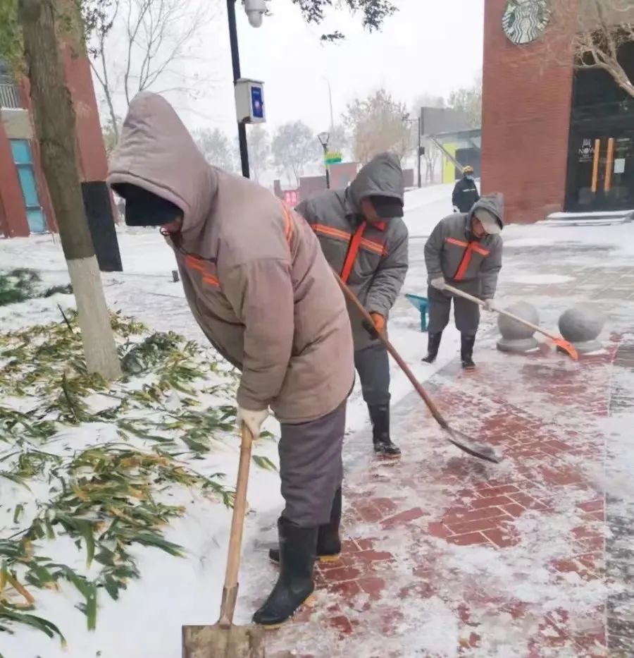 “我们已经对园区门前和主干道的积雪进行了清理,防止积冰路滑,为周末加班的人和周一来上班的人提供安全保障。”锋创科技园相关负责人说道。早在周六晚上雨雪初降时,园区工作人员便进入紧急备战状态,安排除雪方案,制定园区绿化、安保和保洁3个部门人员的分工表。