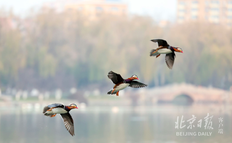 鸳鸯对于北京来说属于“旅鸟”:这表示它只是在迁徙途中路过北京,并不做长时间停留。近年来人们发现一些鸳鸯已经在城市的水域园林中过冬,俨然变成北京的“留鸟”。野生的鸳鸯在北京主要分布在城区有水面的公园,例如龙潭公园、玉渊潭公园、紫竹院公园等地。