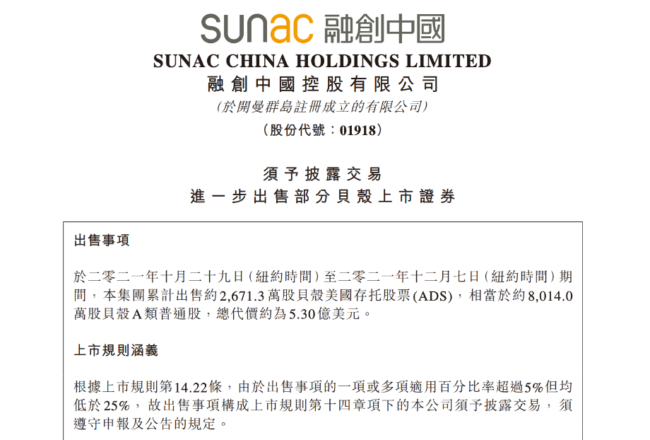 公告显示,融创于2021年10月29日(纽约时间)至2021年12月7日(纽约时间)期间,累计出售约2671.3万股贝壳美国存托股票(ADS),相当于约8014.0万股贝壳A类普通股,总价约为5.30亿美元。