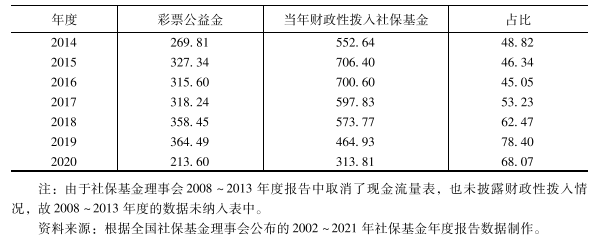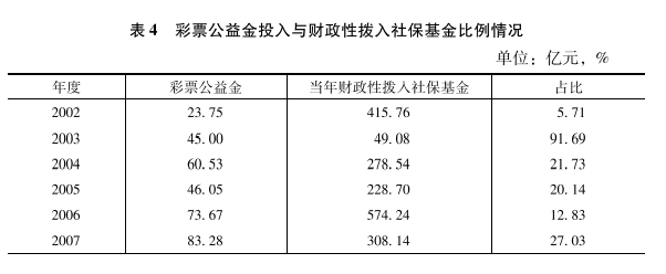 表4数据显示,自从全国社保基金会成立特别是2014年以来,彩票公益金投入额度和比例整体增加。截至2020年末,财政性拨入全国社保基金资金和股份累计达9930.31亿元。其中:一般公共预算拨款3498.36亿元,国有股减转持资金和股份2843.71亿元(减持资金971.59亿元,境内转持股票1028.57亿元,境外转持股票843.55亿元),彩票公益金3588.24亿元,贡献高达36.13%,超过了一般公共预算拨款。虽然这部分资金并未立即用于与社会福利相关的项目,但是彩票公益金显然已成为全国社保基金所有来源中比重最大的一个,从而为增进我国人民福祉、维护社会正常稳定提供了重要保障。
