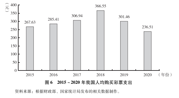 蓝皮书指出,2020年我国人均购买彩票236.51元,持续下降。