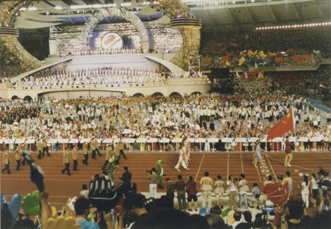 1990年9月22日至10月7日,第十一届亚运会在北京举行。来自37个国家和地区的运动员参加了在工人体育场举行的开幕式。中国派出的670名运动员参加了27个大项的比赛,共获金牌183枚、银牌107枚和铜牌51枚,金牌总数位居榜首。亚运会期间,我国运动健儿奋勇拼搏,打破1项世界纪录,30次破亚洲记录,96次创亚运会纪录,为中国晋级亚洲第一竞技体育强国做出了贡献。