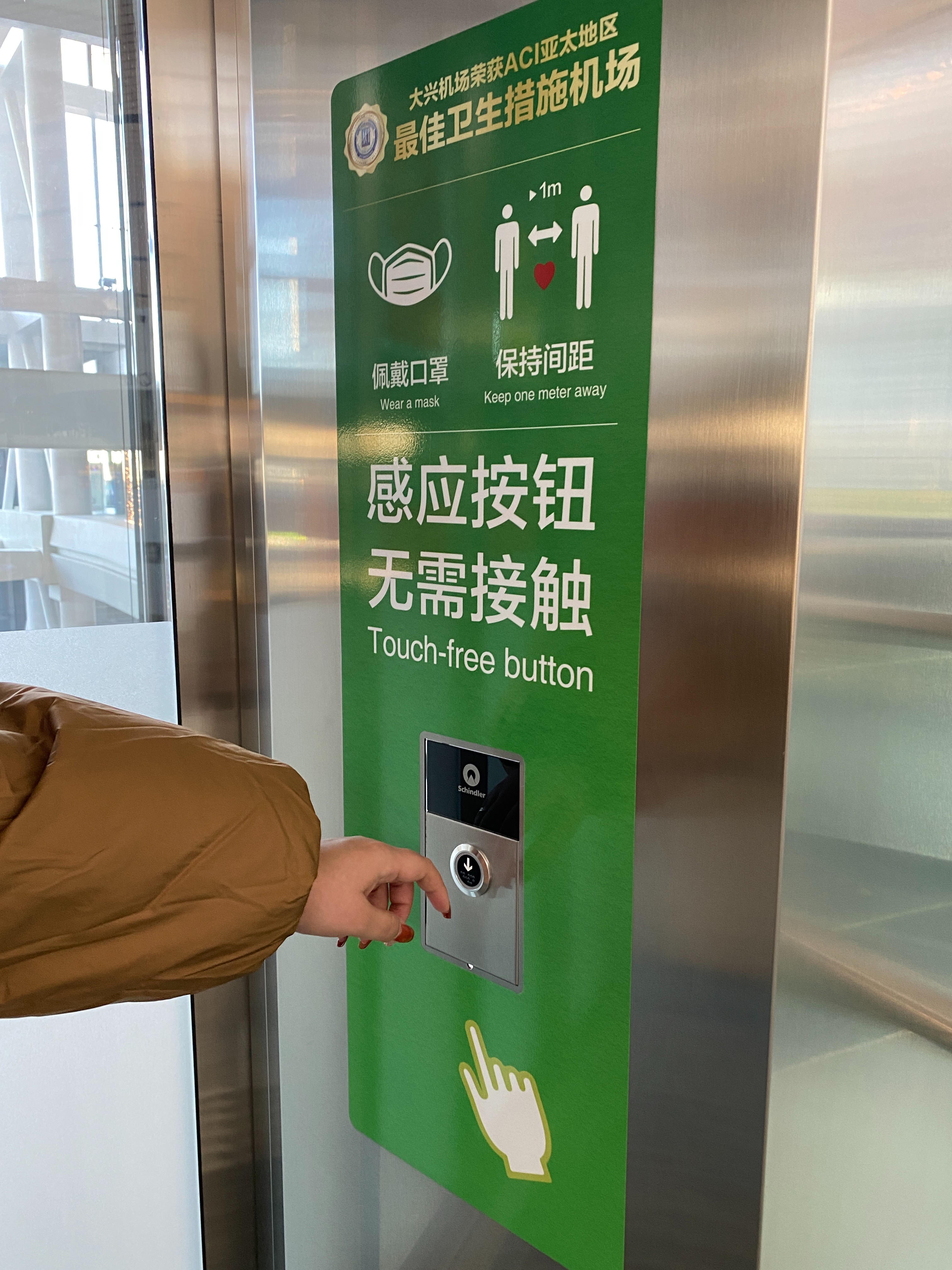 据了解,为了让每一位旅客顺畅、便捷出行,大兴机场在科技防疫方面做足了功课。在机场航站楼的电梯轿厢内,均安装了无接触按钮。旅客乘坐电梯,无需按住按钮,只需手指悬于按钮上方,电梯就可以自动感应。这种“无接触”服务措施,既能提高旅客春运期间的出行效率,又能有效减少交叉感染的风险。
