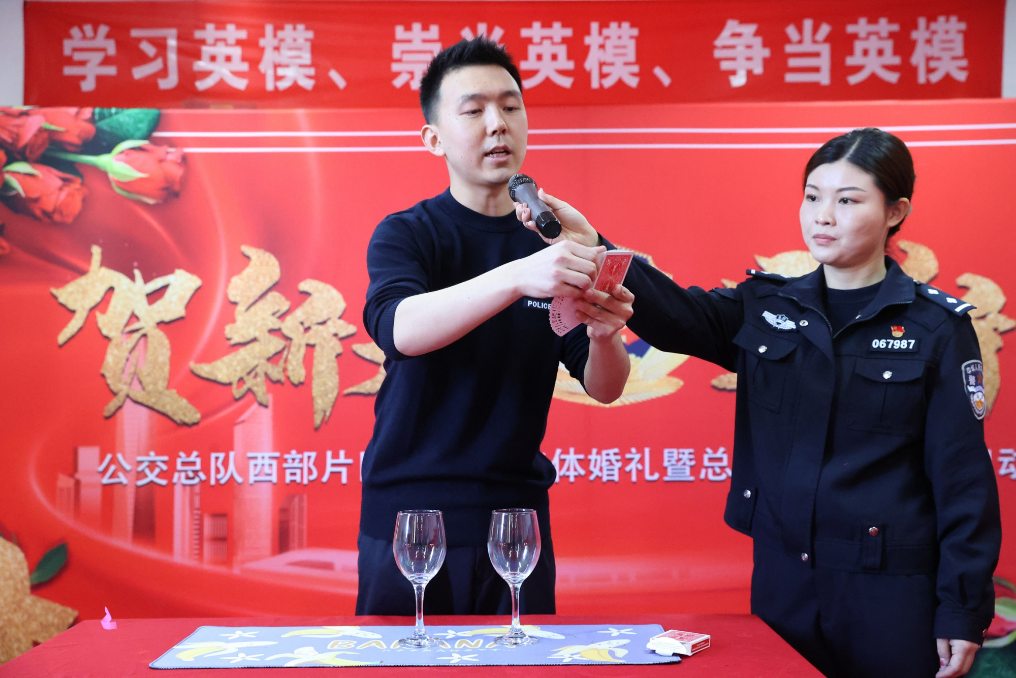 集体婚礼仪式礼成后,总队文艺轻骑兵小分队分别以歌曲、舞蹈、魔术等形式为新人们献上了精彩的演出,送上了真挚祝福。