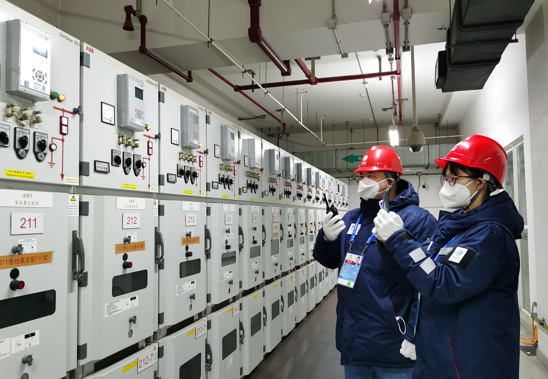 2月2日,国家游泳中心电力保障团队对配电室设备开展巡视,为北京冬奥会首场比赛提供安全可靠电力保障。(李伯源摄)