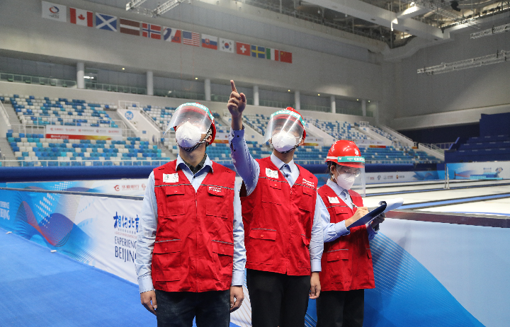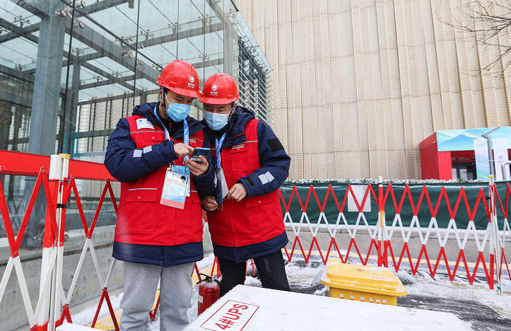 国家电网首都电力(朝阳)共产党员服务队队员在“冰立方”开展日常巡视工作。(李伯源摄)
