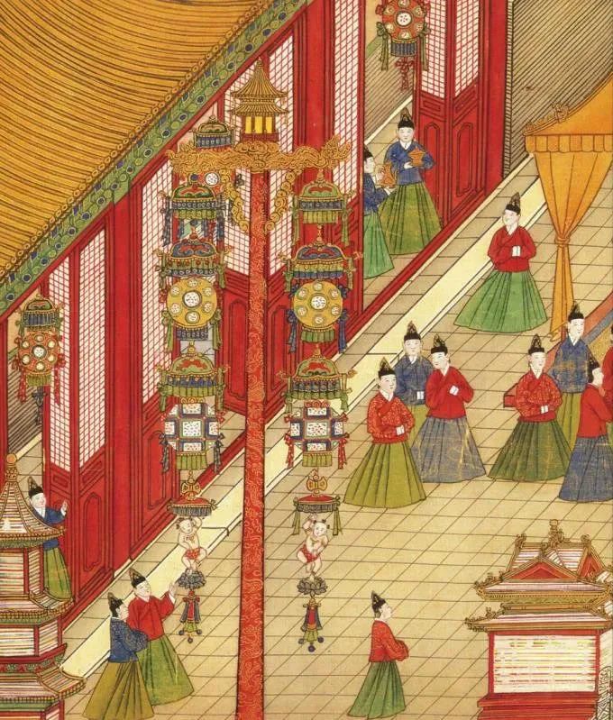 《明宪宗元宵行乐图》中的万寿灯,其上悬挂成串的绣球灯、娃娃灯,极尽巧思。