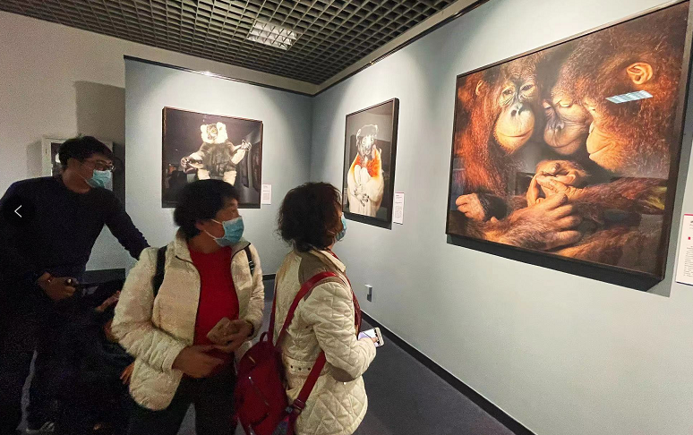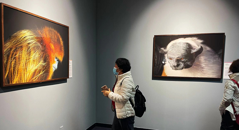 该馆展览策划部主任苗雨雁介绍,展览展出的作品涵盖了《世界自然保护联盟受胁物种红色名录》中的易危动物、濒危动物、极危动物、野外灭绝以及已灭绝的物种。略暗的灯光、精湛的作品,步入一层临时展厅,让人仿佛踏进了一间艺术画廊,“之前看到的动物摄影作品大多聚焦动物的全貌,或者动物的某些特殊姿态、行为或生态环境;我们此次展出的作品,则聚焦动物的静态肖像,观众走近细看,很容易感受到画面里流淌的动人情愫。”
