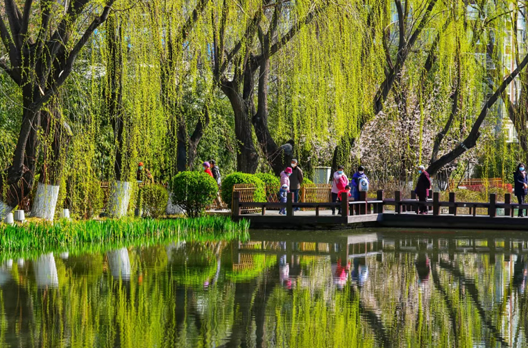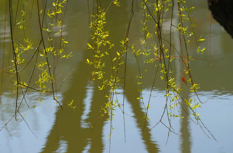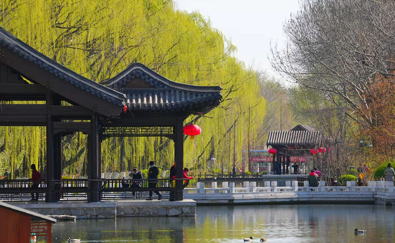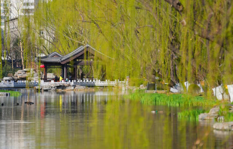 4月1日,春风和煦,在积水潭桥附近一处静谧的城市公园“潭西胜境”景区内,翠柳拂风,碧波映衬下,鱼儿浅游,满眼新绿,郁郁葱葱中,浓浓春意俯拾皆是。