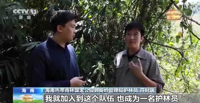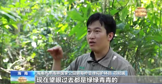 海南热带雨林国家公园鹦哥岭管理局护林员符财瑞:植被慢慢就恢复起来了,比如以前满山都是光秃秃的,现在望眼过去都是绿绿青青的,就像习总书记说过,绿水青山就是金山银山,现在我们看到这片林子生机盎然,给我们一种很自豪的感觉。