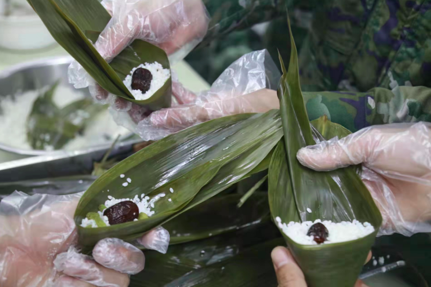 粽子虽小,门道不少,一折叶、二盛料、三压实、四包严、五扎绳,看似简单,但是要做出馅料饱满,外观漂亮的粽子可不容易。每名官兵都展现出自己的拿手绝活,有江南的尖角肉粽、陕北的大枣粽,还有寓意民族团结和谐的红豆糯米粽。大家各显身手,悉心求教,相互品评,好不热闹。包粽子过程中,大家还聊起节日风俗、民族文化和家乡趣事,欢乐的节日气氛感染了在场的每一个人,活动现场粽叶飘香,其乐融融。