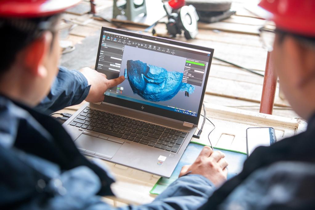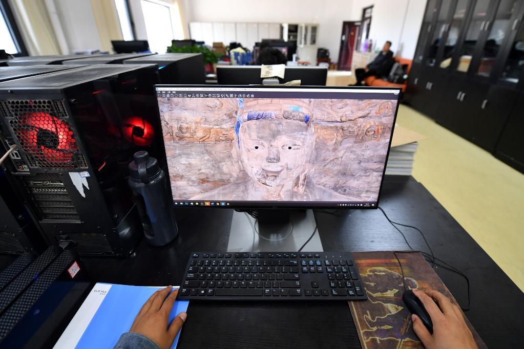 5月11日,在云冈石窟第17窟,工作人员在分析采集到的石窟数据信息。