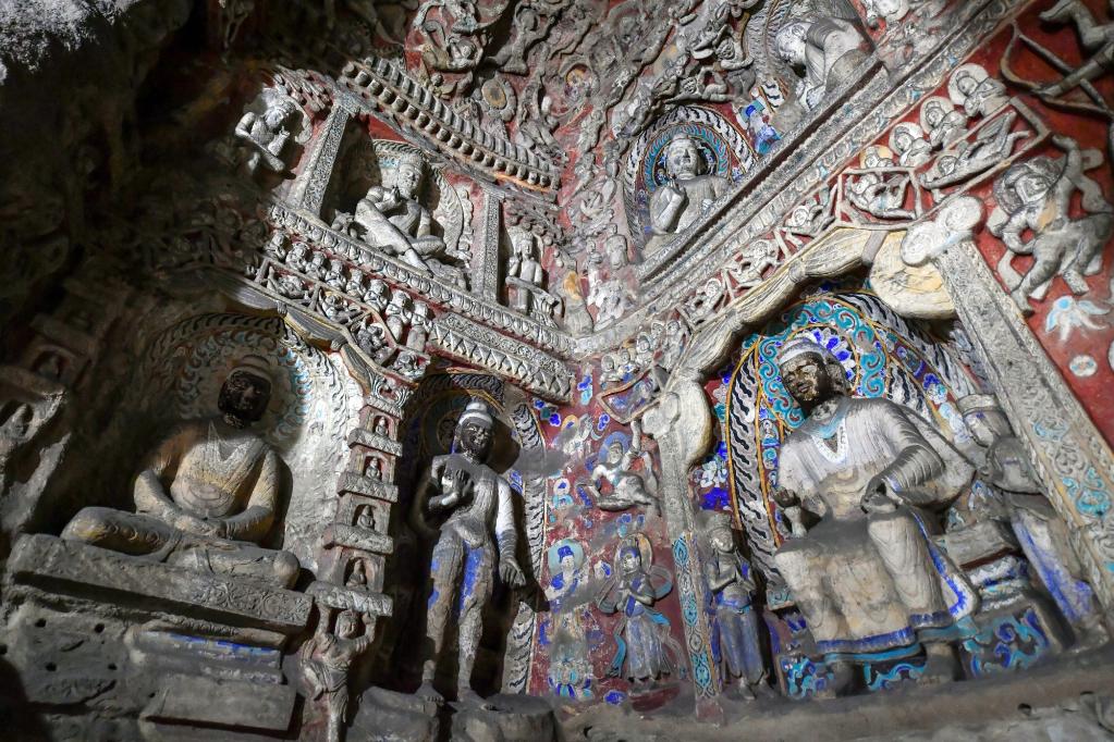 山西大同云冈石窟的佛像(2021年5月9日摄)。
