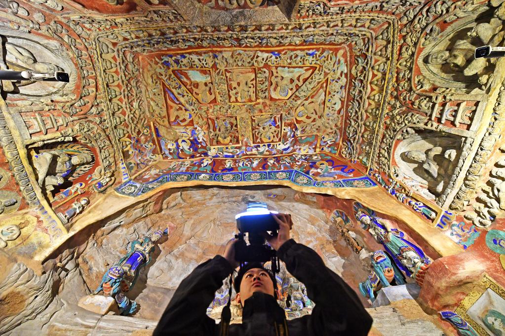 5月11日,在云冈石窟第17窟,工作人员在采集影像数据。