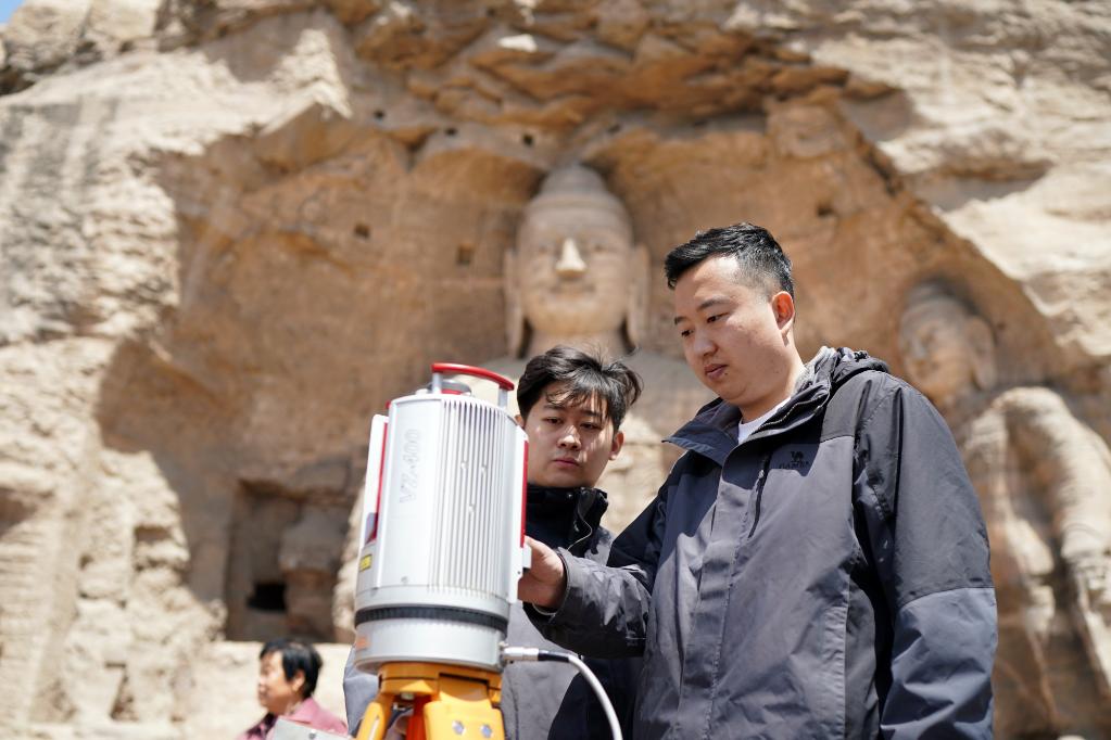 在山西大同云冈石窟,工作人员在进行数据采集(2021年5月8日摄)。