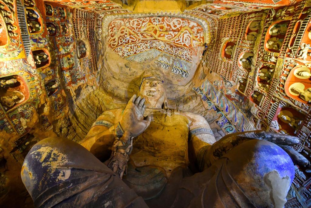 山西大同云冈石窟的佛像(2021年5月7日摄)。