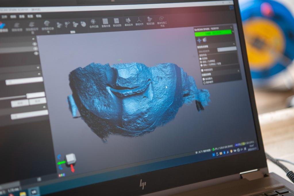 5月11日,在云冈石窟第17窟,工作人员通过手持式三维激光扫描仪获取石窟的高精度几何三维模型。