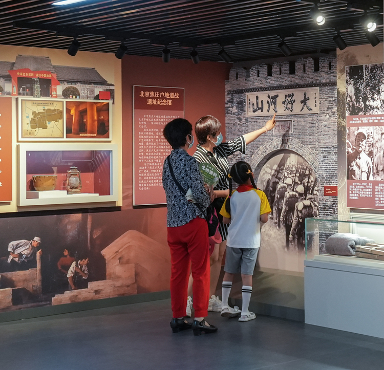 展厅中,主视频“烽火印记——北京抗日战争主题片区巡礼”循环播放,介绍着北京抗战主题片区的建设情况。这里面有关抗战遗存的视频图像以及展览中的照片均为抗战馆调研团队实地拍摄。