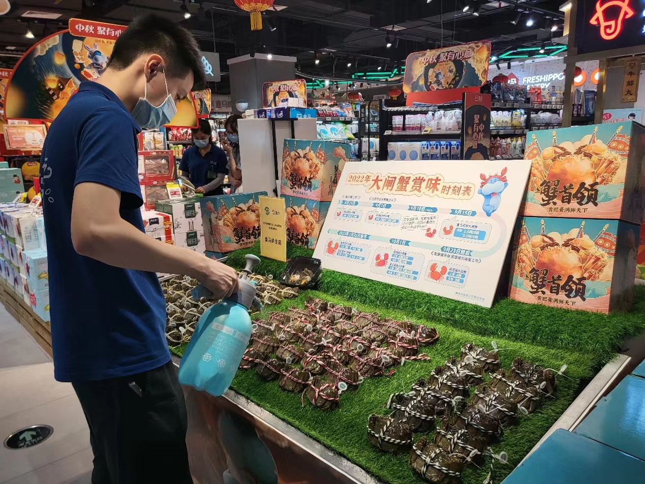 记者在盒马门店看到,冰台上出现三种规格的大闸蟹,均是母蟹,来自江苏产区。工作人员介绍,每隔一两个小时会给大闸蟹喷水“保湿”,库存的螃蟹则在15摄氏度左右的冷藏室里“乘凉”。