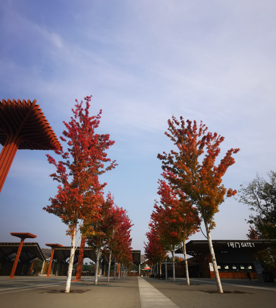 一号门内外,高大的银红槭红意正浓,大气的礼乐大门成为红色景观的背景,步行在一号门广场,游客可以感受到被红叶包裹的秋意。