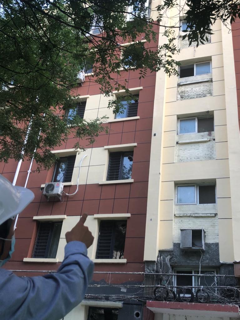 (金四区教工楼小区在增加外墙保温施工过程中为加装电梯预留接口。)