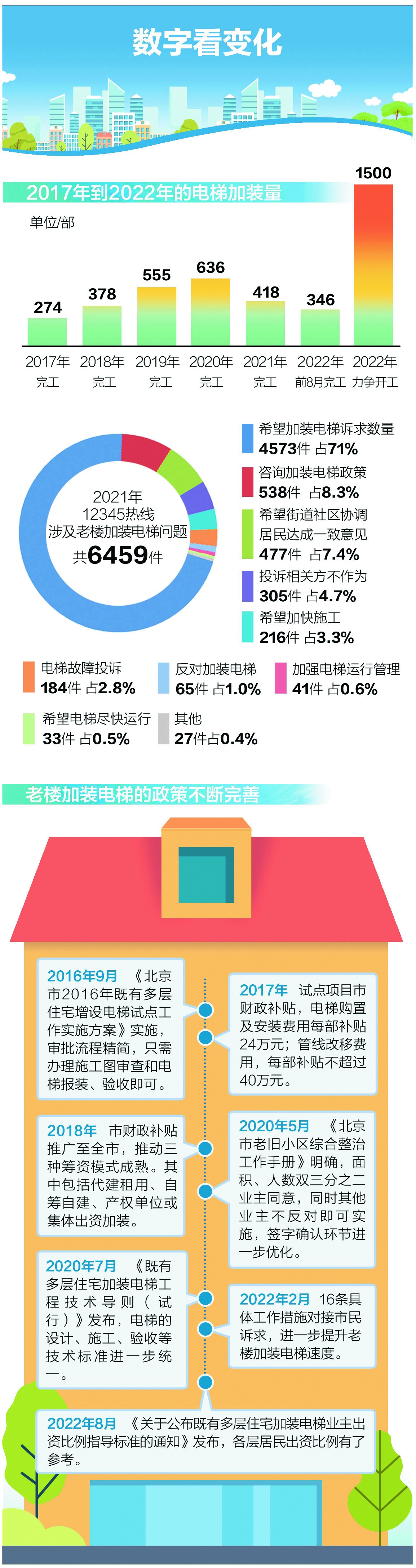 老楼加装电梯是今年接诉即办“每月一题”的第一道大题。回顾2021年,市民对老楼加装电梯的期盼值很高,统计发现,12345市民热线有关老楼加装电梯问题的诉求当中,希望加装电梯的诉求数量占问题总量的七成以上,政策的不断完善和相关各方的持续努力让大家看到了希望。市民的期盼是政府工作的动力和方向,与2021年相比,今年全市老楼加装电梯计划开工数量翻了一番。至少开工1000部,力争开工1500部的背后,不仅有16条具体措施的政策支持,更有各区在啃“硬骨头”时表现出的决心,以及不断创新机制的基层智慧。