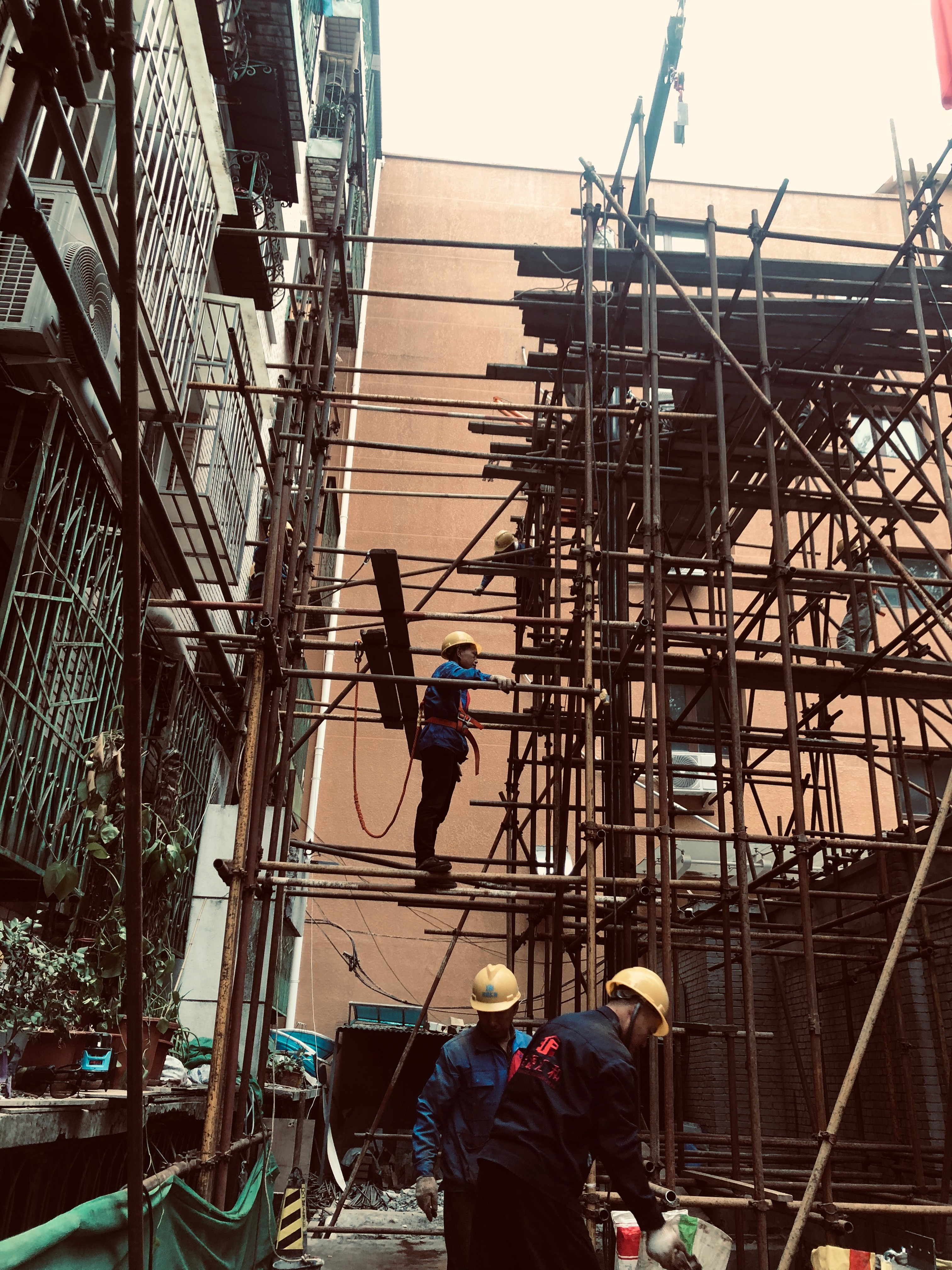 (里仁东街5号楼前施工受限,在无法动用大型机械的情况下,电梯加装工程全靠人拉肩扛。)