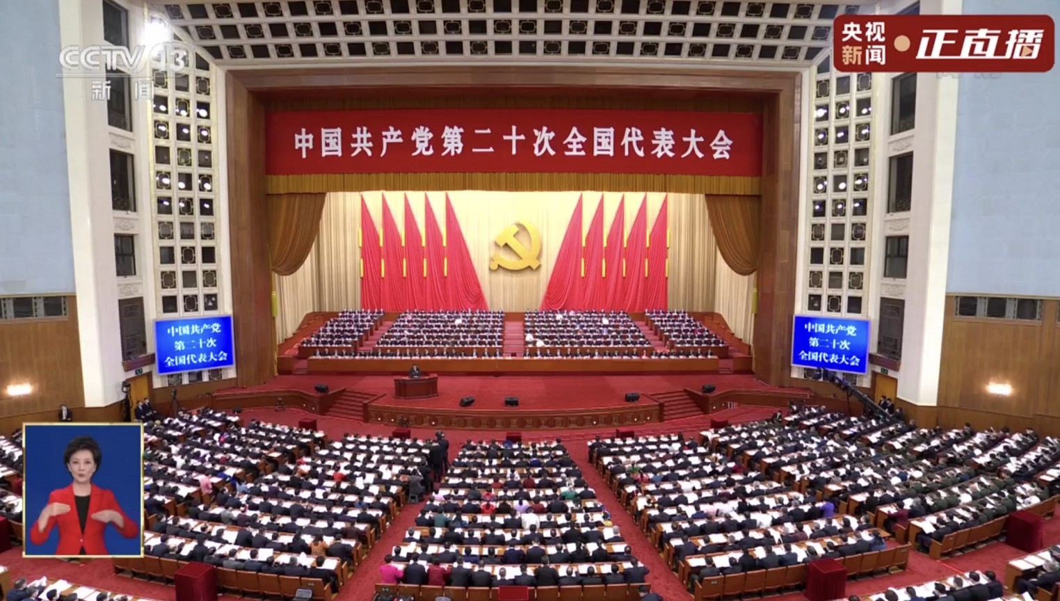 10时,党的二十大隆重开幕。周晔穿着合体的红西服,出现在大大小小的屏幕里。开幕会期间,她从容不迫地用双手将盛会“说”给听障人士听。