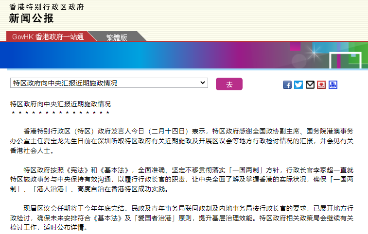 香港特区政府今天(2月14日)发布新闻公报称,特区政府感谢全国政协副主席、国务院港澳事务办公室主任夏宝龙日前在深圳听取特区政府有关近期施政及开展区议会等地方行政检讨情况的汇报,并会见有关香港社会人士。