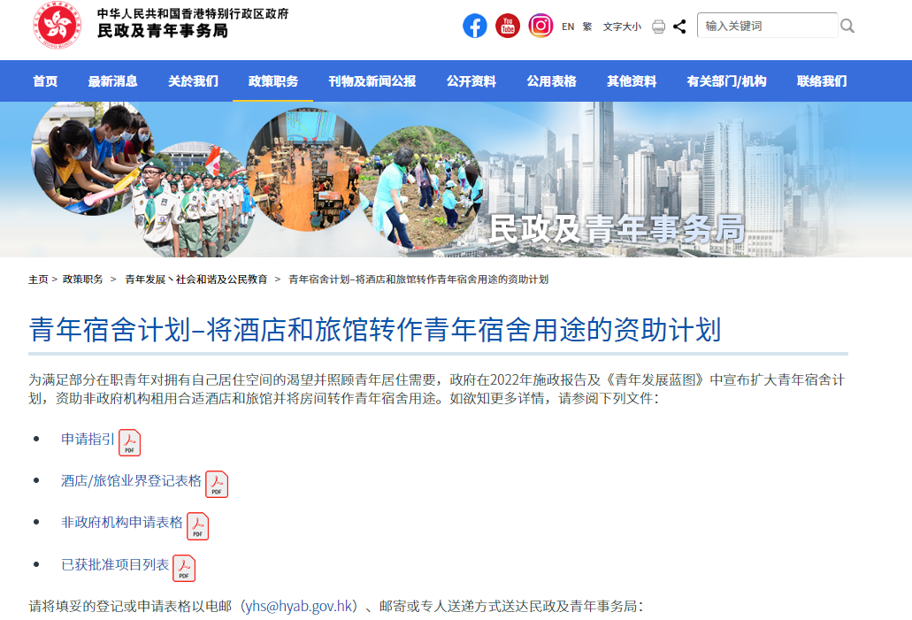 香港特区政府民政及青年事务局(民青局)今天(3月14日)向香港青年联会批出首个“将酒店和旅馆转作青年宿舍用途的资助计划”项目。该项目位于港岛铜锣湾摩理臣山道一栋酒店,共97间房间,可提供最多194个宿位。