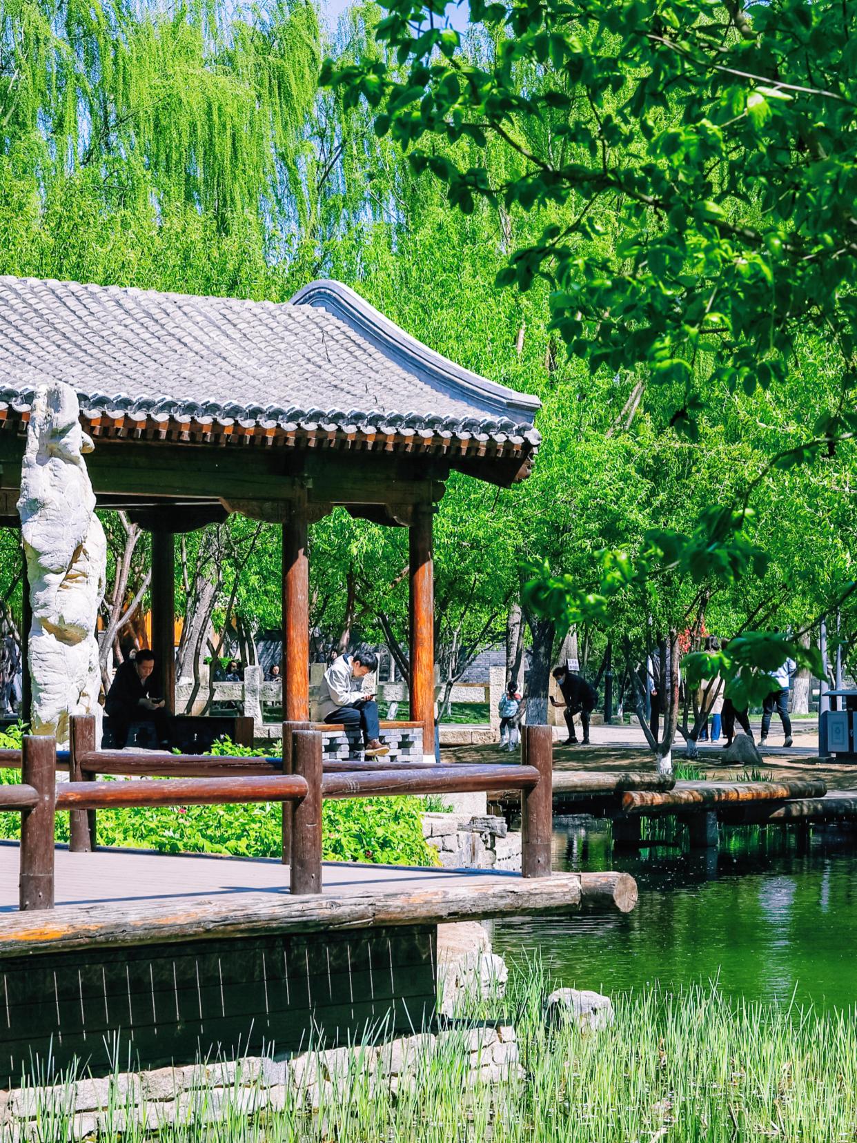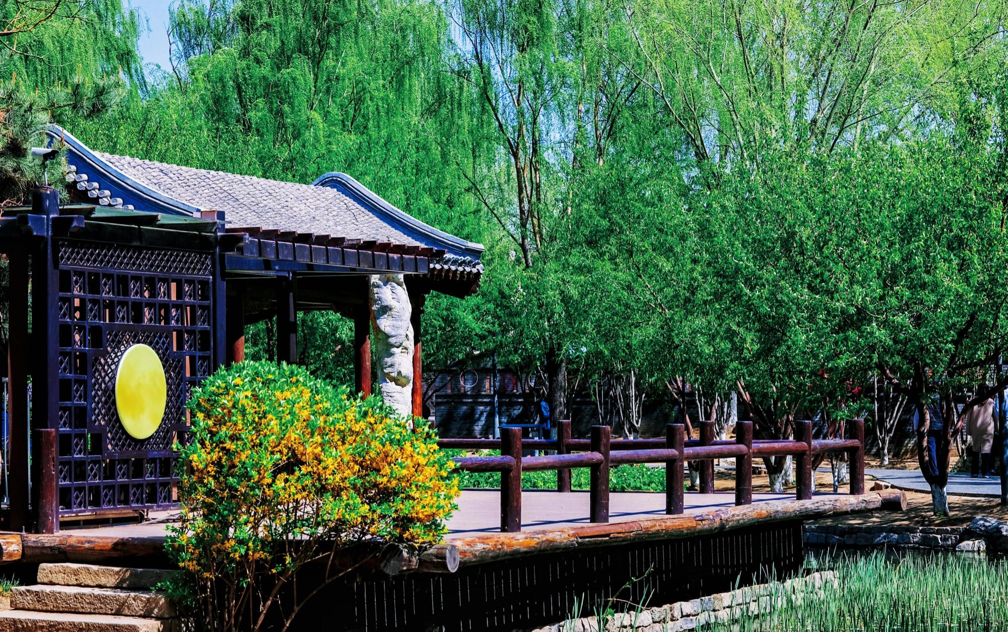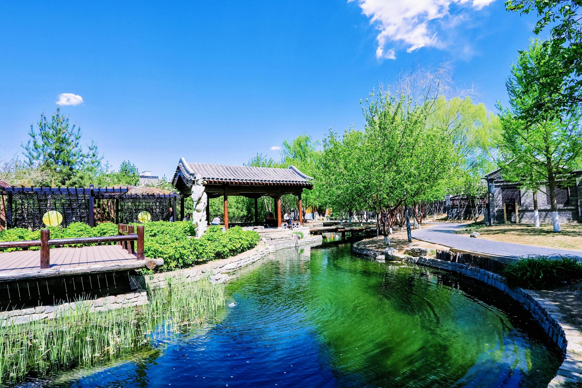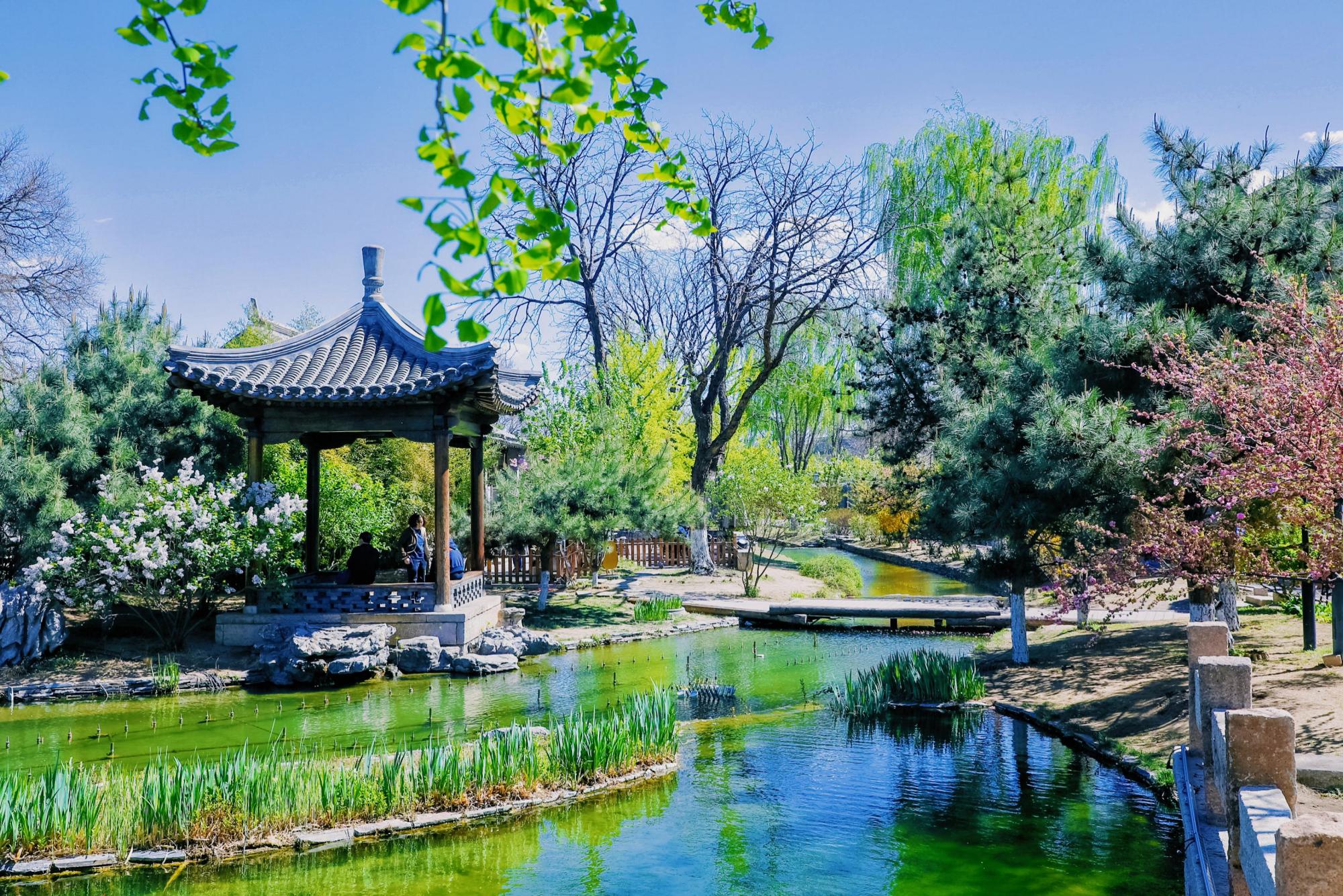 前门三里河公园经过改造后重现了明朝时期的“水穿街巷”,青灰的四合院、斑驳的石板路与周围景色相互映衬,全然一副江南水乡的风韵,又包含着老北京的胡同文化。