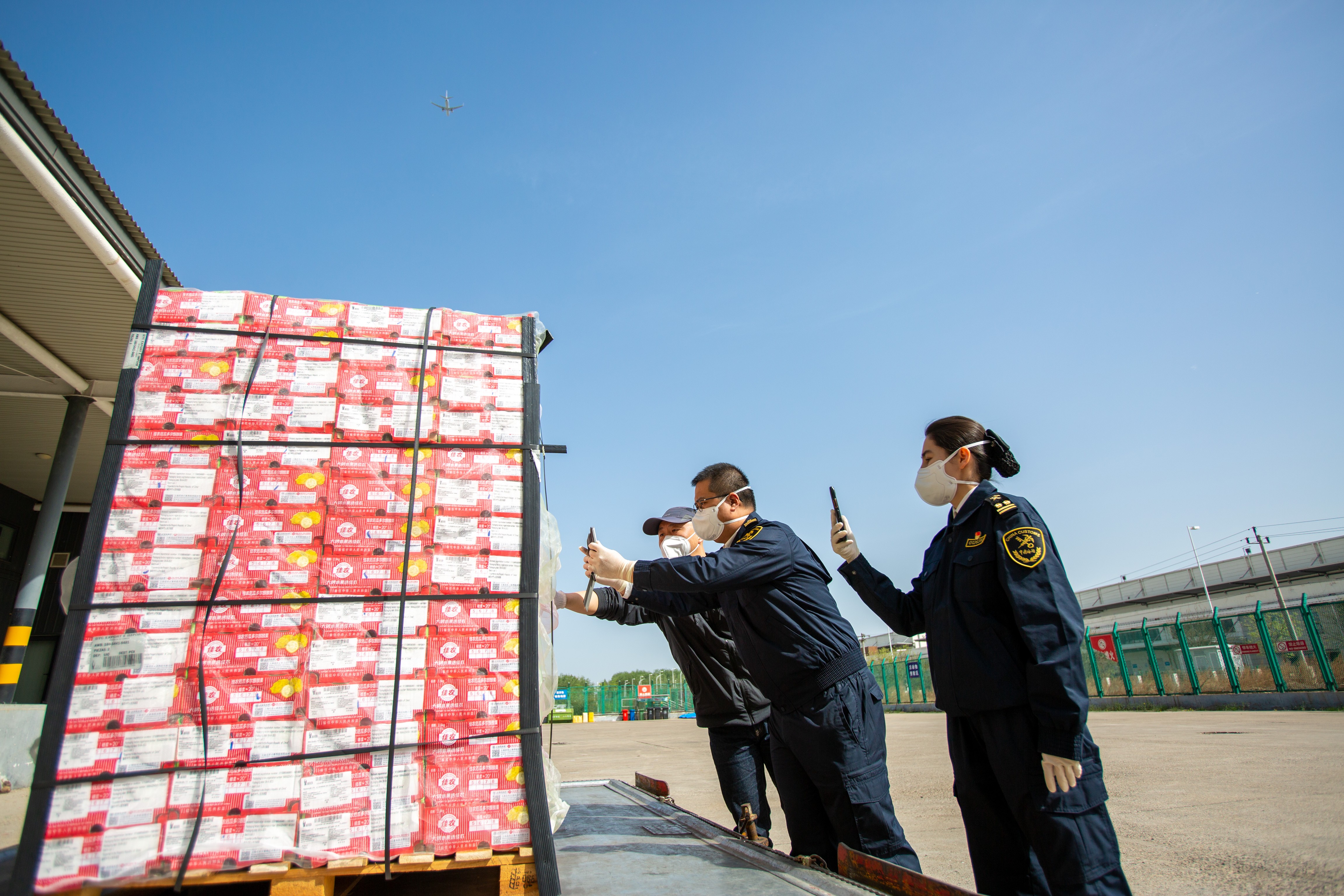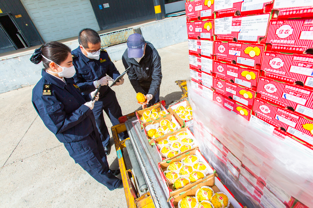 为做好这批“麒麟果”的检疫通关工作,助力水果抢“鲜”上市,首都机场海关提前制定检疫监管方案,积极联系对接地面代理企业,及时追踪航班抵港时间,确保“即到即查”。在海关监管场地,现场关员快速核对输华标签、植物检疫证书等证单,并实行外观检查等检疫措施,未发现有害生物,这批990公斤的水果被快速放行。