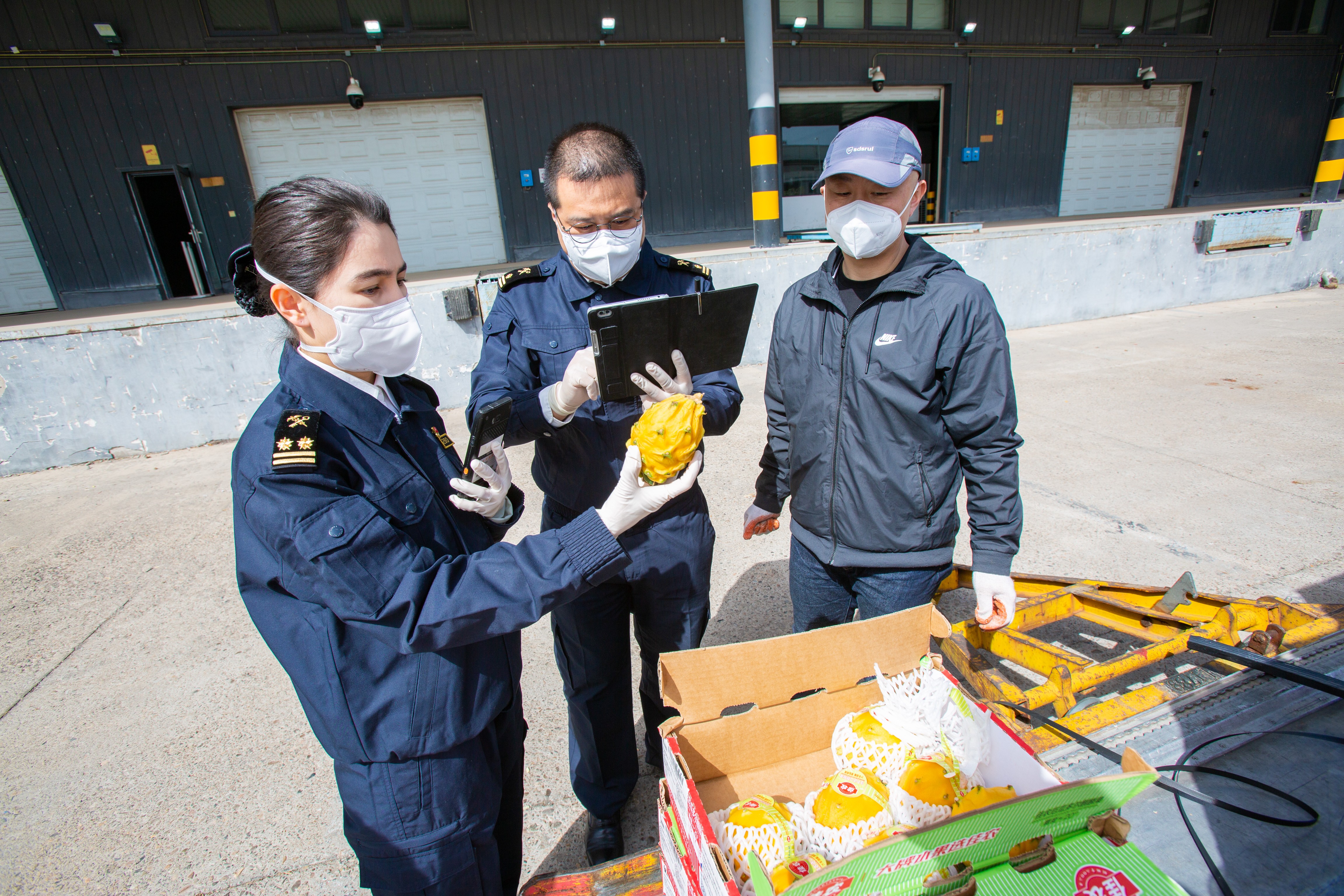 首都机场海关关员快速验放北京口岸首次进口的厄瓜多尔黄色火龙果。(摄影:方星)