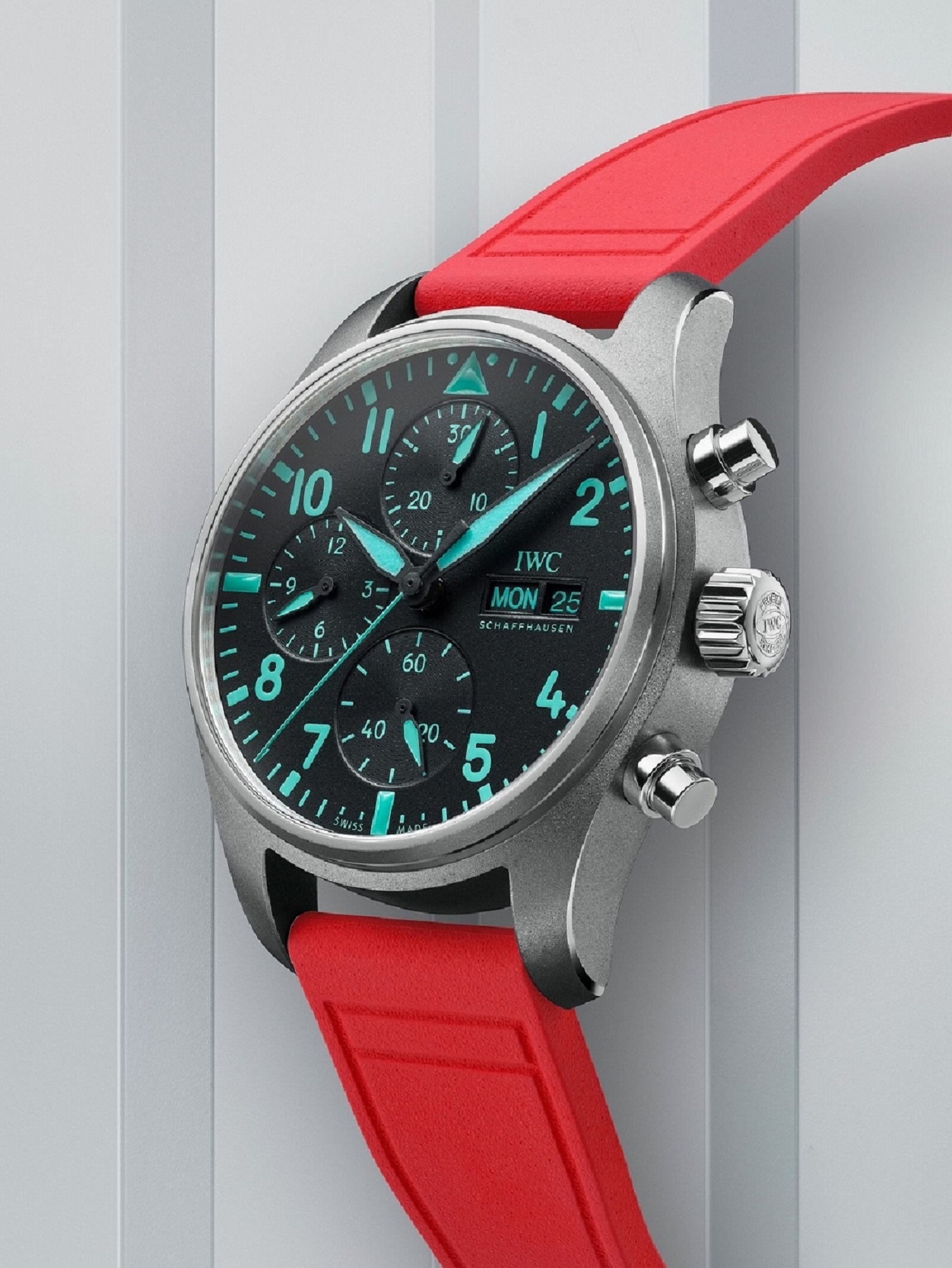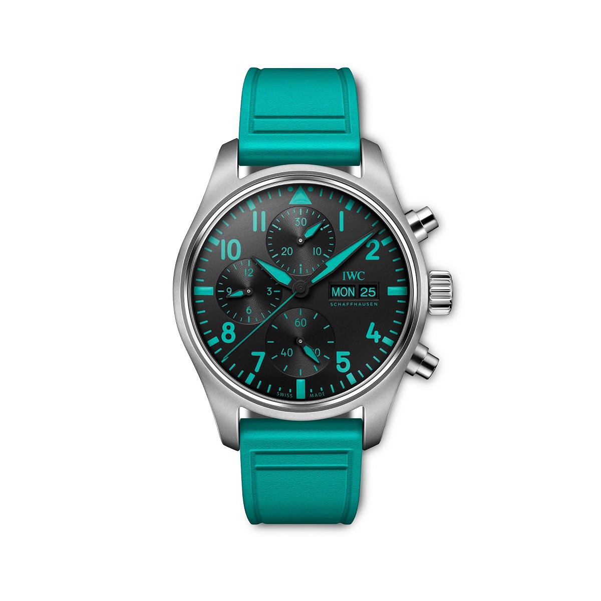 飞行员计时腕表41梅赛德斯-AMG马石油F1车队特别款 (型号IW388108) 新添黑色小牛皮表带,将于线上持续发售。配备“迈阿密粉色”橡胶表带的新款腕表 (型号IW388114) 还将提供绿色表带,表带皆配备EasX-CHANGE®表带快速更换系统,无需额外工具即可轻松更换表带。