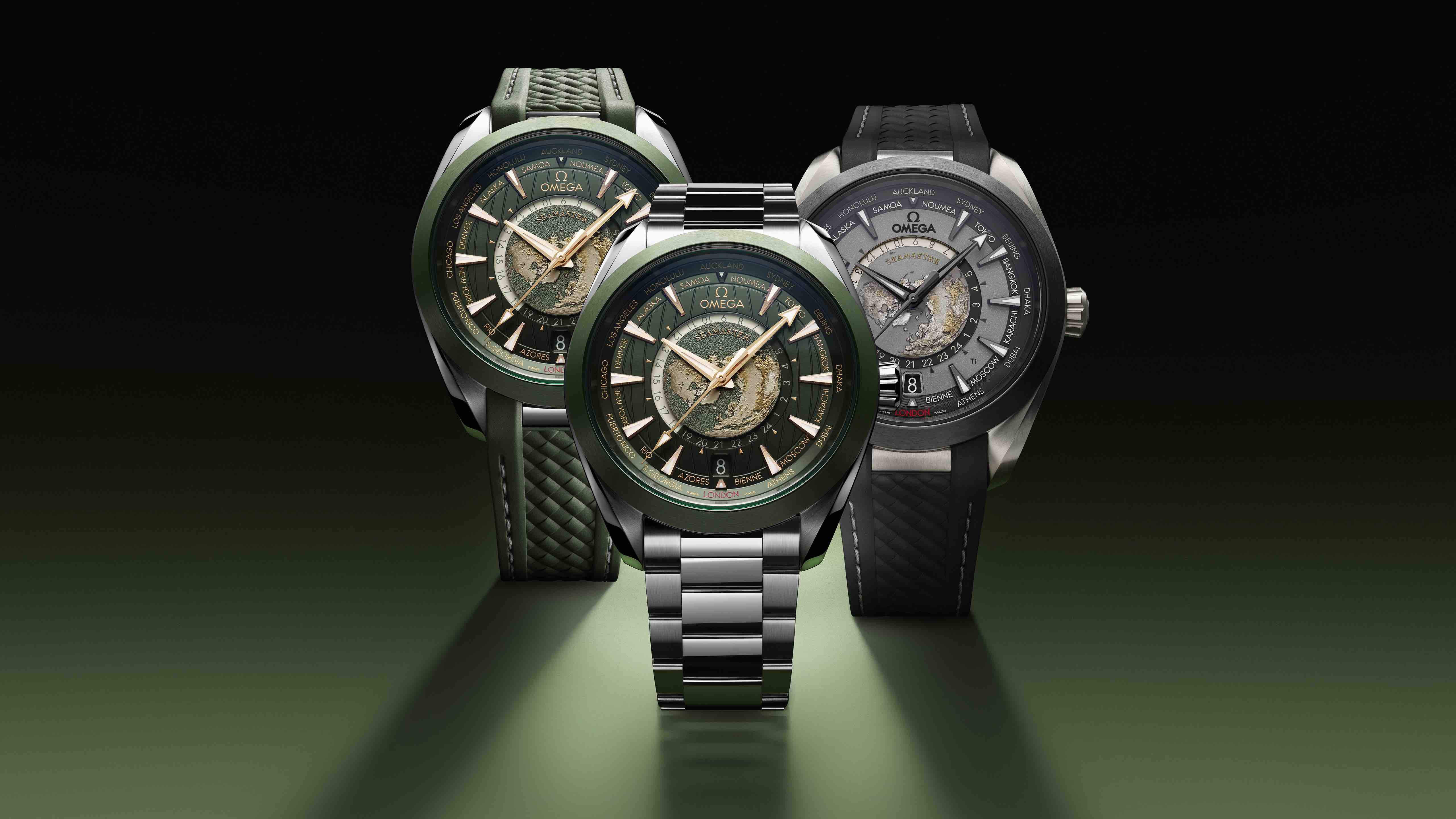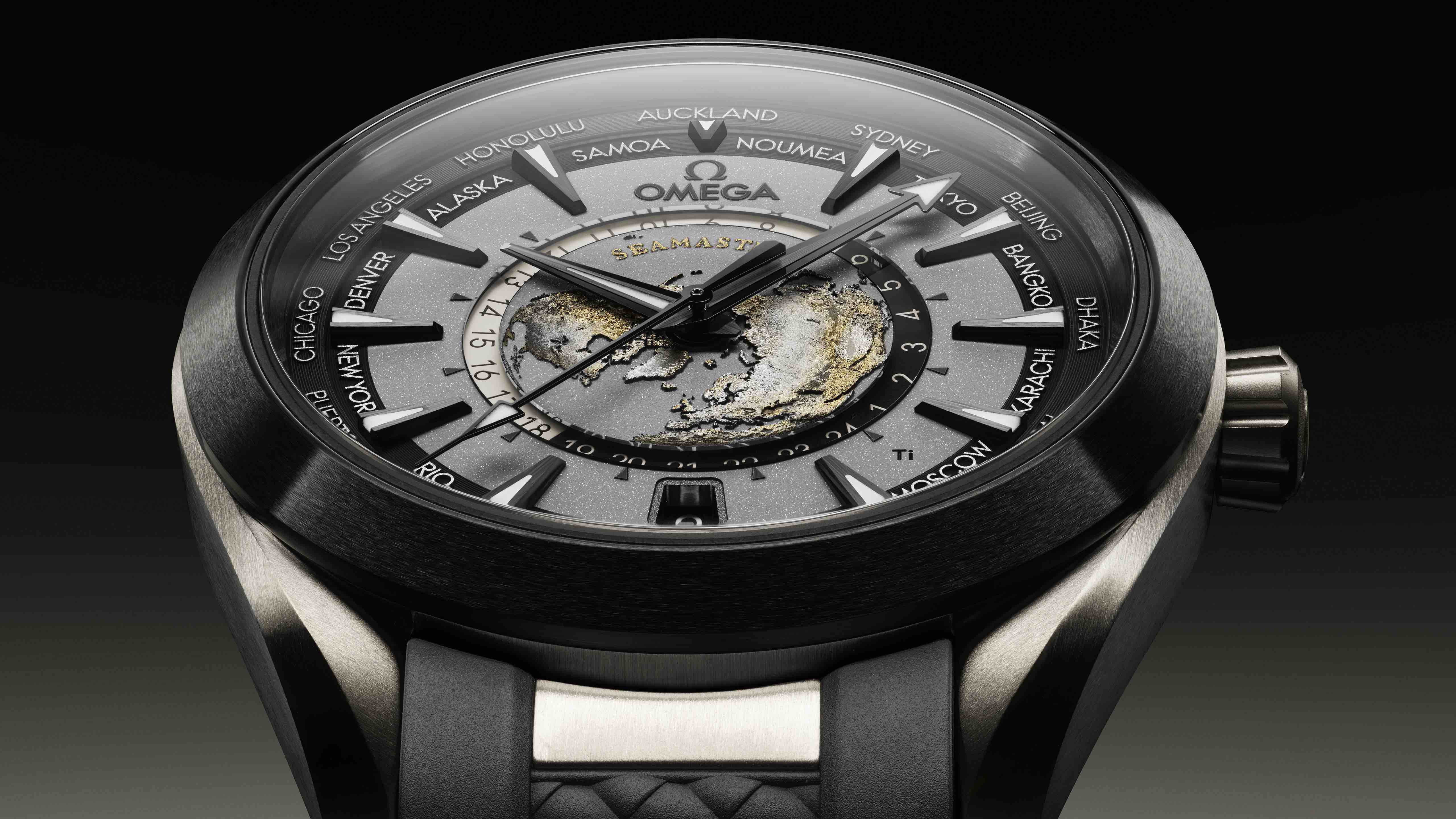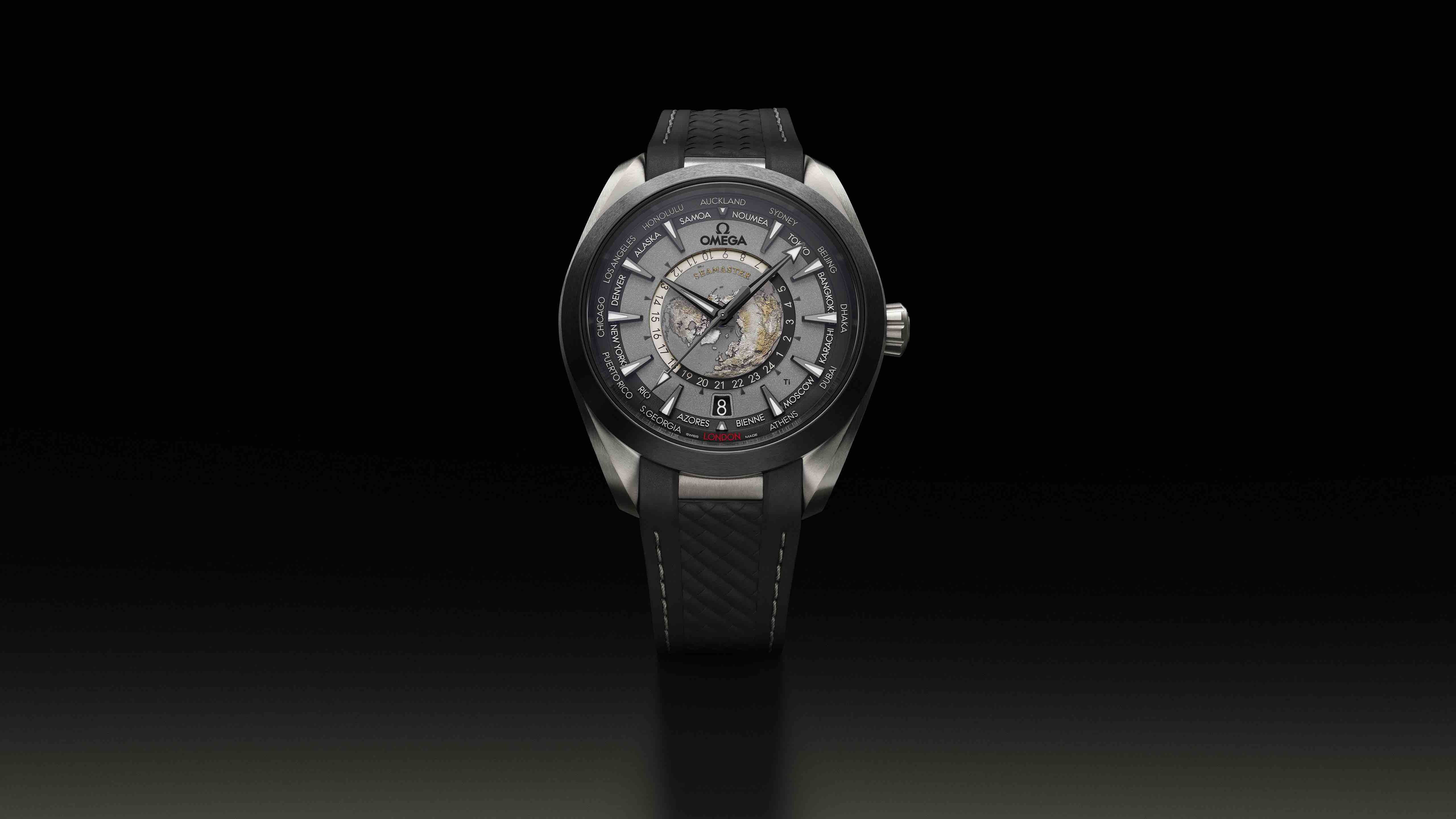Aqua Terra世界时腕表的表壳为43毫米,其中一款采用轻巧且耐腐蚀的2级钛金属打造而成,堪称重磅之作。欧米茄采用激光技术打造出整个黑灰色表盘,包括其呈现的色彩、小时刻度以及城市名字等。表盘没有采用任何转印元素,“LONDON”字样的红色漆面则由手工工艺制成。为了呼应哑光表盘,这款腕表搭配经拉丝处理的黑色陶瓷表圈,指针和小时刻度均经黑化处理,并覆以白色Super-LumiNova夜光涂层,在黑暗环境中散发蓝色的光芒。腕表搭配一体式黑色橡胶表带,饰有灰色缝线,表扣采用2级钛金属制成,令腕表的整体风格大胆前卫且兼具运动风尚。