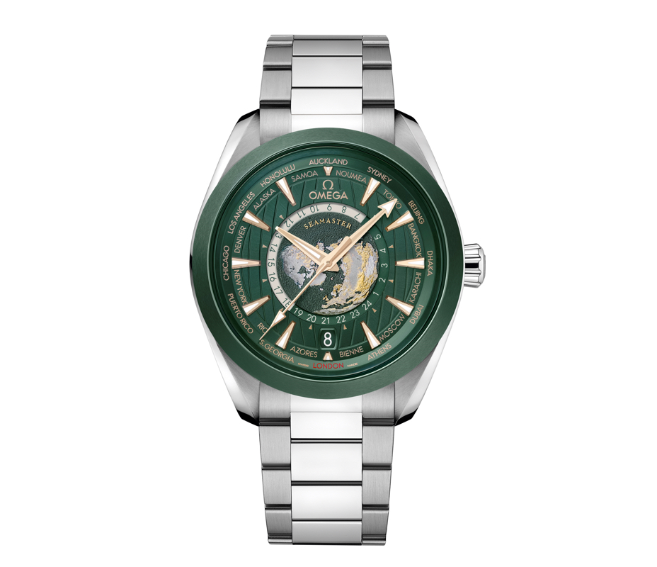 2023年,欧米茄海马系列Aqua Terra世界时腕表再添新作,推出三款全新时计臻品,包含一枚钛金属款和两枚精钢款。其中,钛金属表款的独特表盘以激光烧蚀技术雕刻而成。