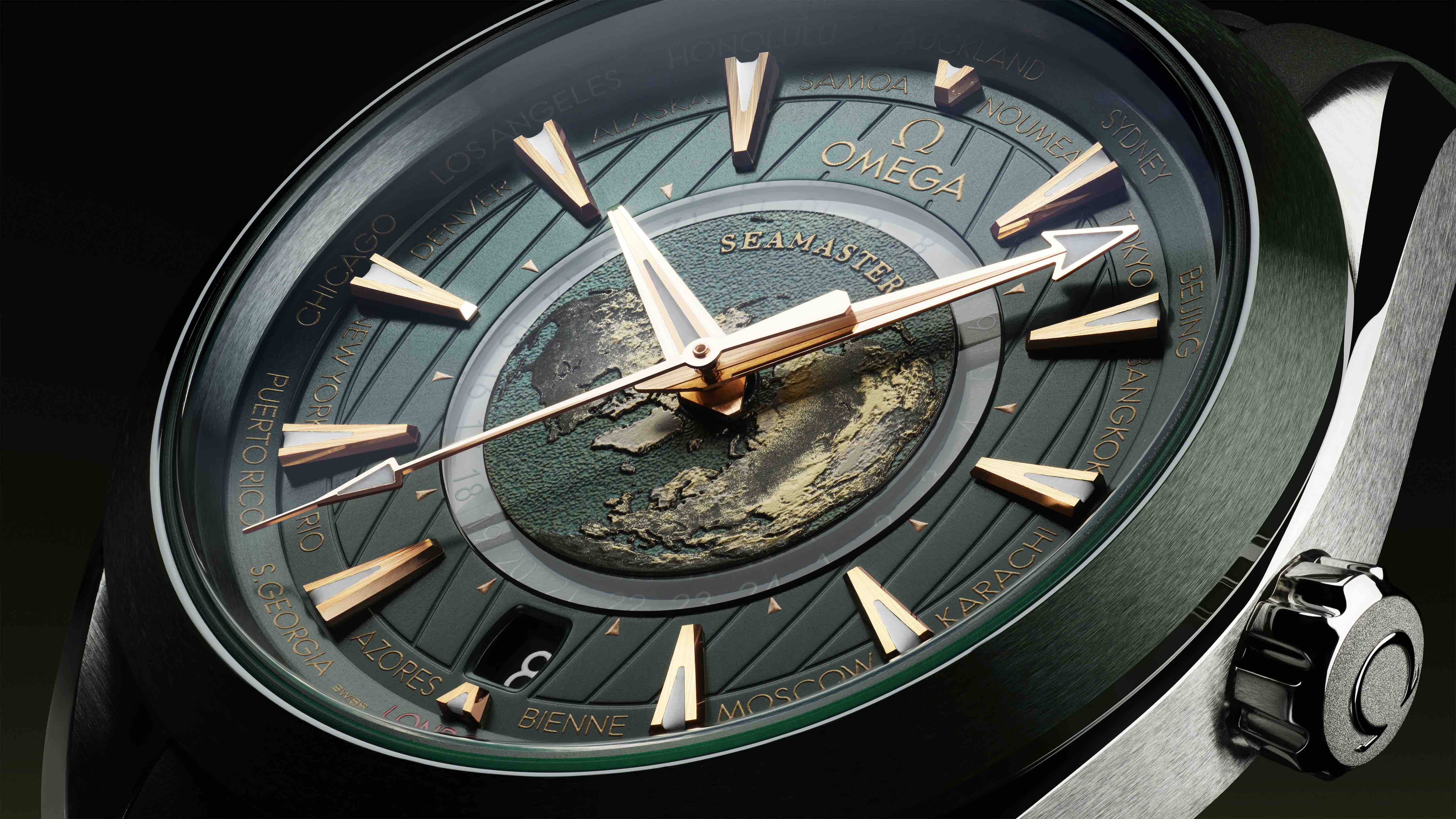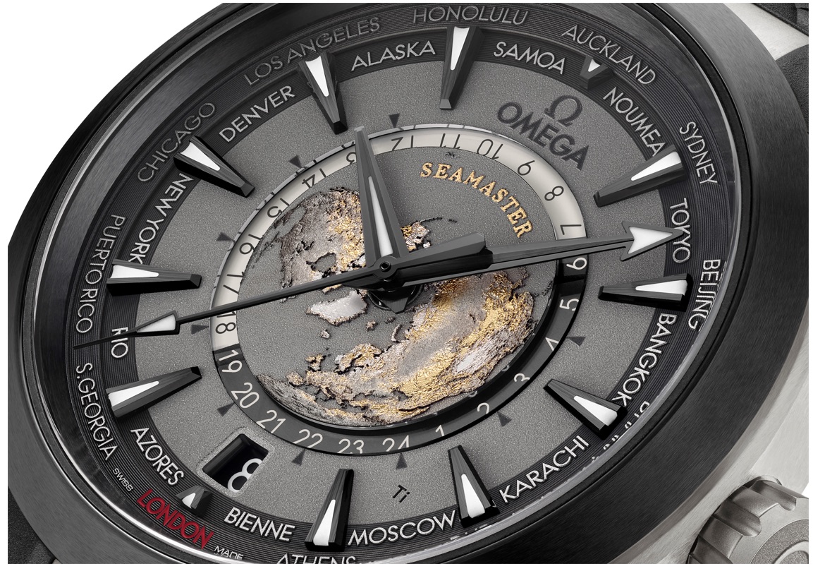 表盘周围环绕有世界各地24个城市的名字,分别代表不同的时区,欧米茄总部所在地瑞士比尔 (BIENNE) 亦是其中之一。格林威治标准时间,即世界标准时 (UTC) 所在城市的伦敦以红色标注,精钢款表盘的其他城市饰以金色。