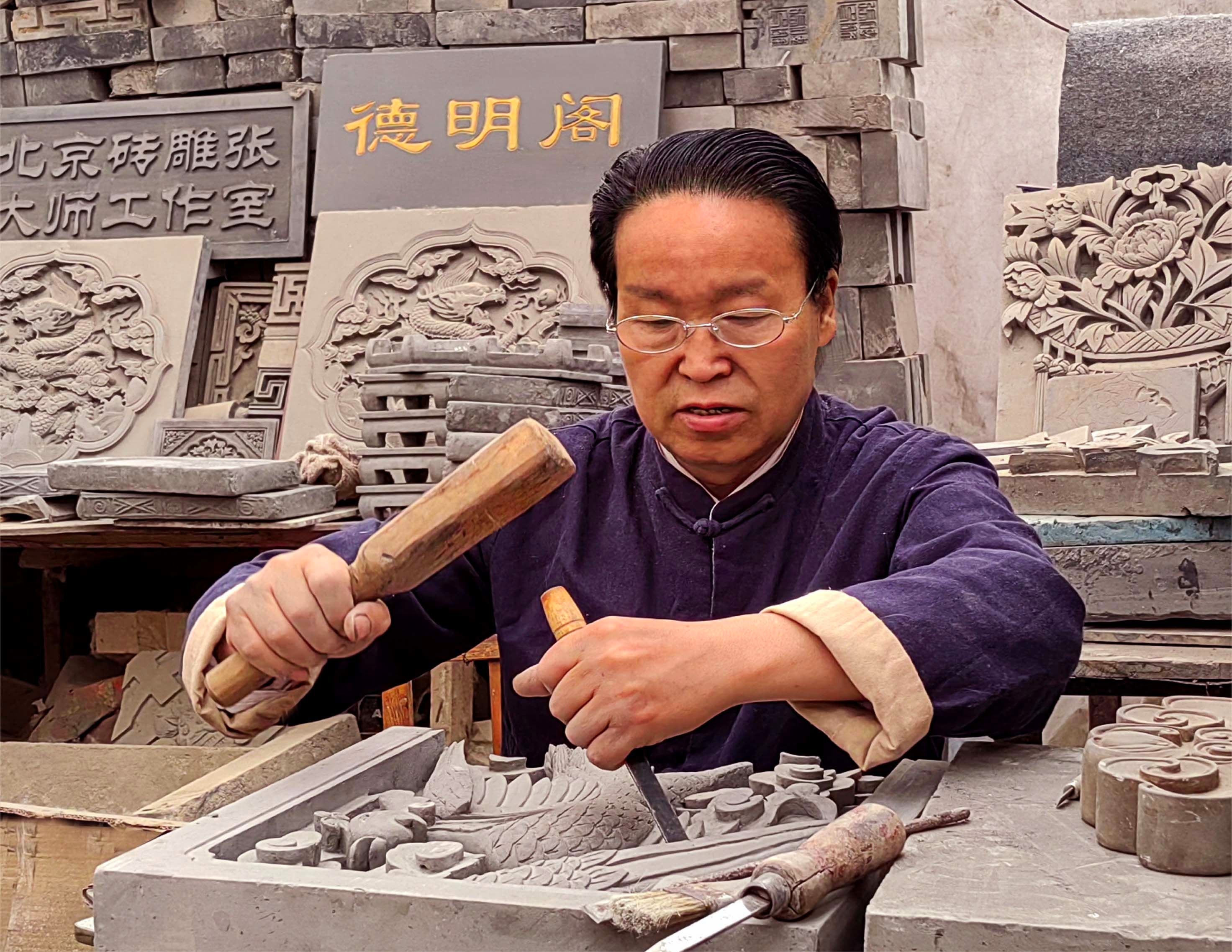过去,北京砖雕多用于皇家建筑、园林及贵官府邸,四合院的影壁、垂花门、廊心墙上也常以此为饰。“手用三种刀,祖传七十二式刀法,再加上心授口传的口诀,做出来就是雄浑大气的北京砖雕。”在北京市级非遗项目北京砖雕代表性传承人、“砖雕张”第六代传承人张彦看来,50年的坚守不仅关乎一门濒危技艺,更是对北京老城文脉的延续。