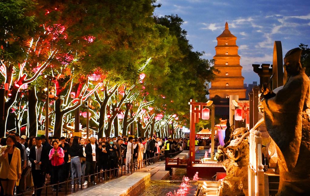 游客在西安大唐不夜城游览(5月8日摄)。新华社发(邹竞一 摄)